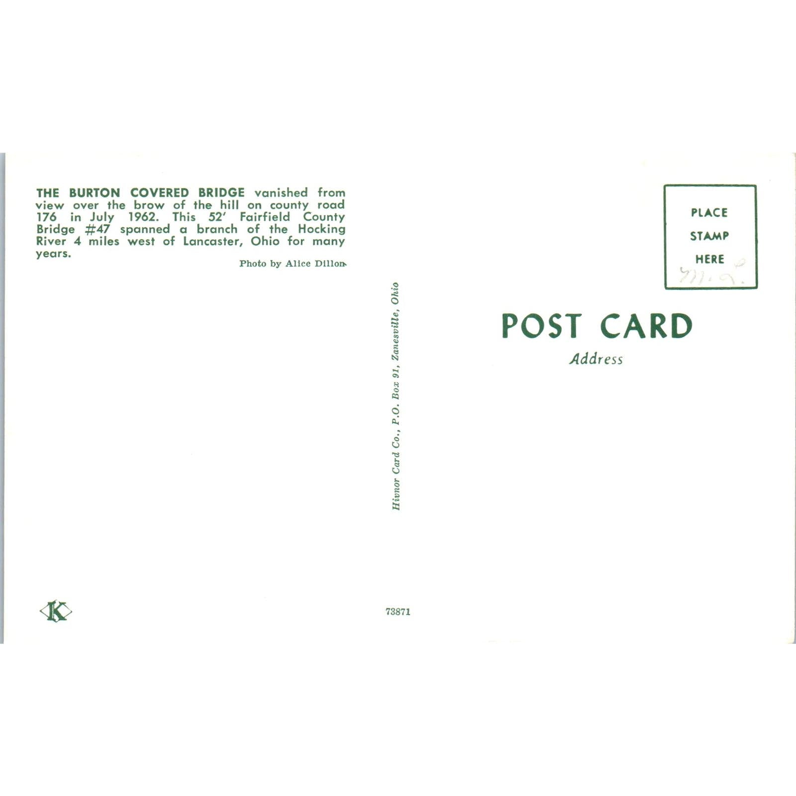 Burton Bridge Fairfield County #47 Lancaster OH Covered Bridge Postcard PB10