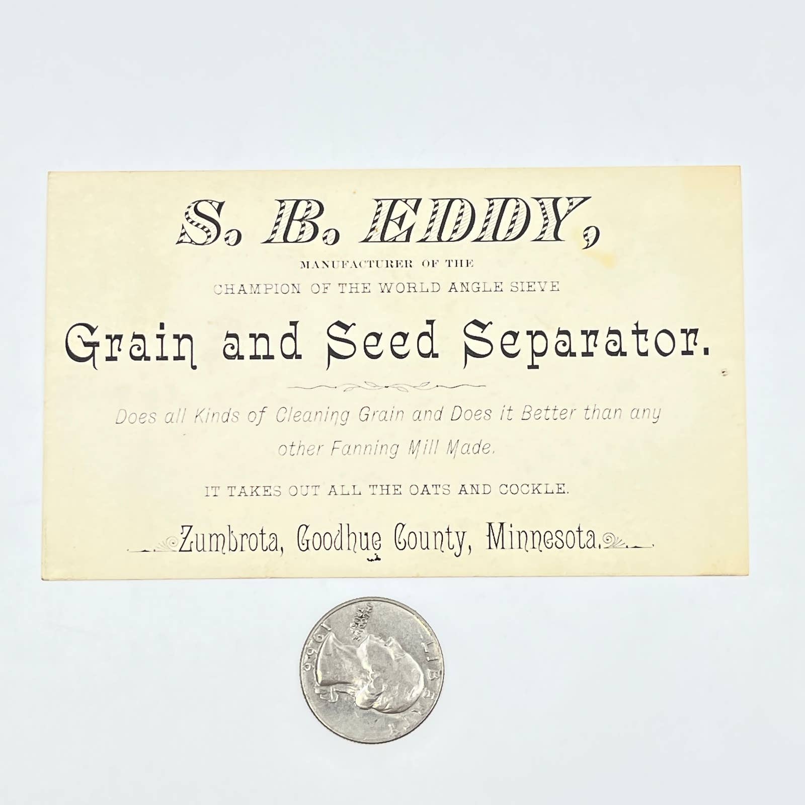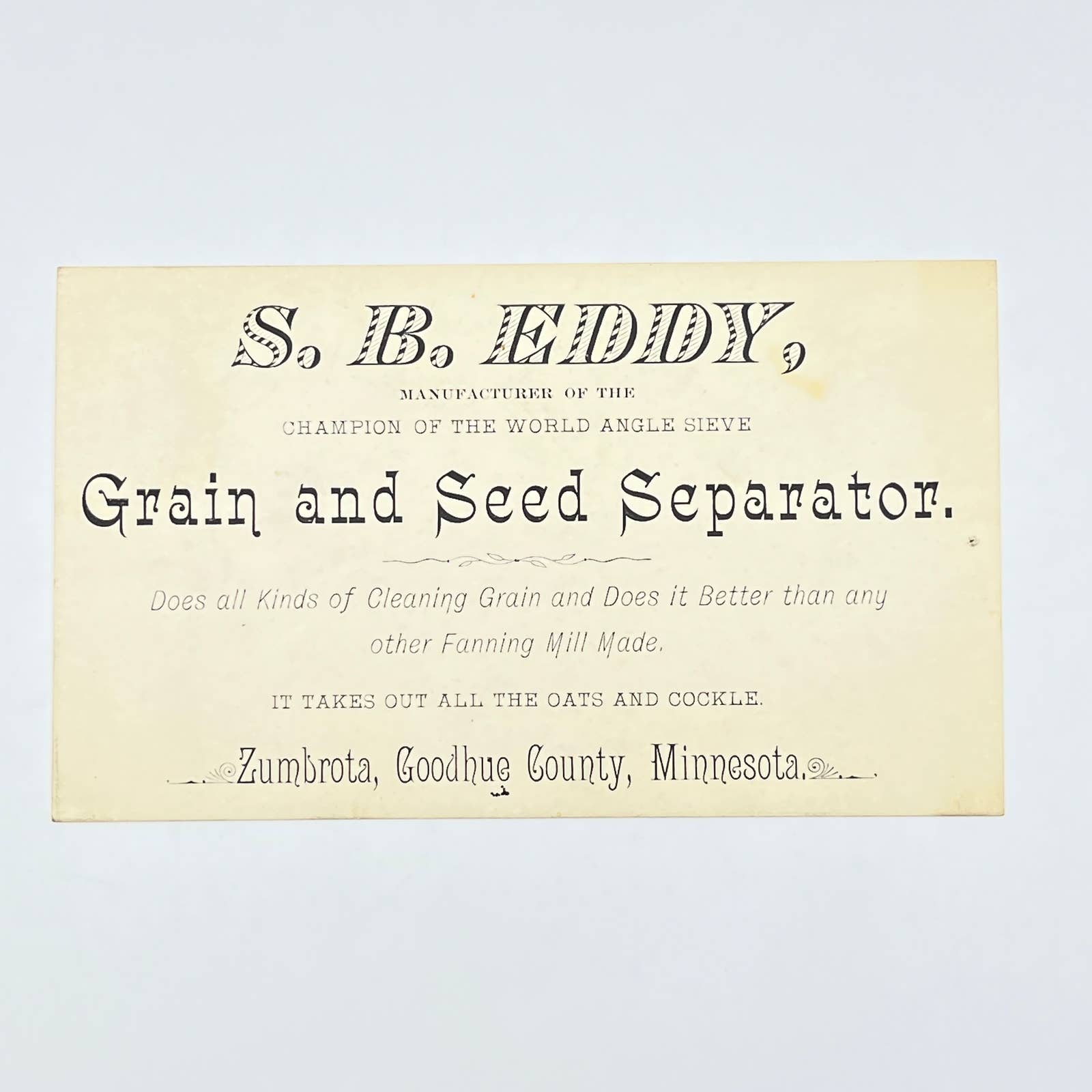 c1900 Trade Card S.B. Eddy Grain & Seed Separator Zumbrota Goodhue County MN AC2