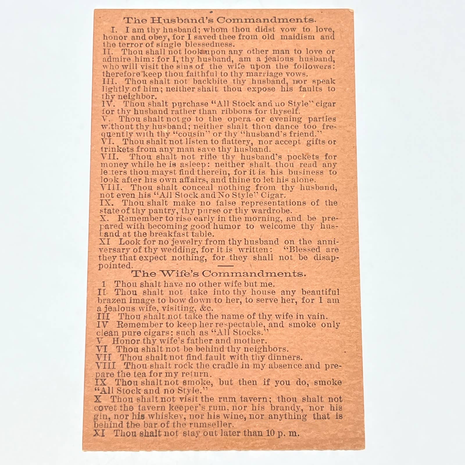 c1900 Trade Card Smoke Elwin's All Stock & No Style Cigars Husband Commandments AC2