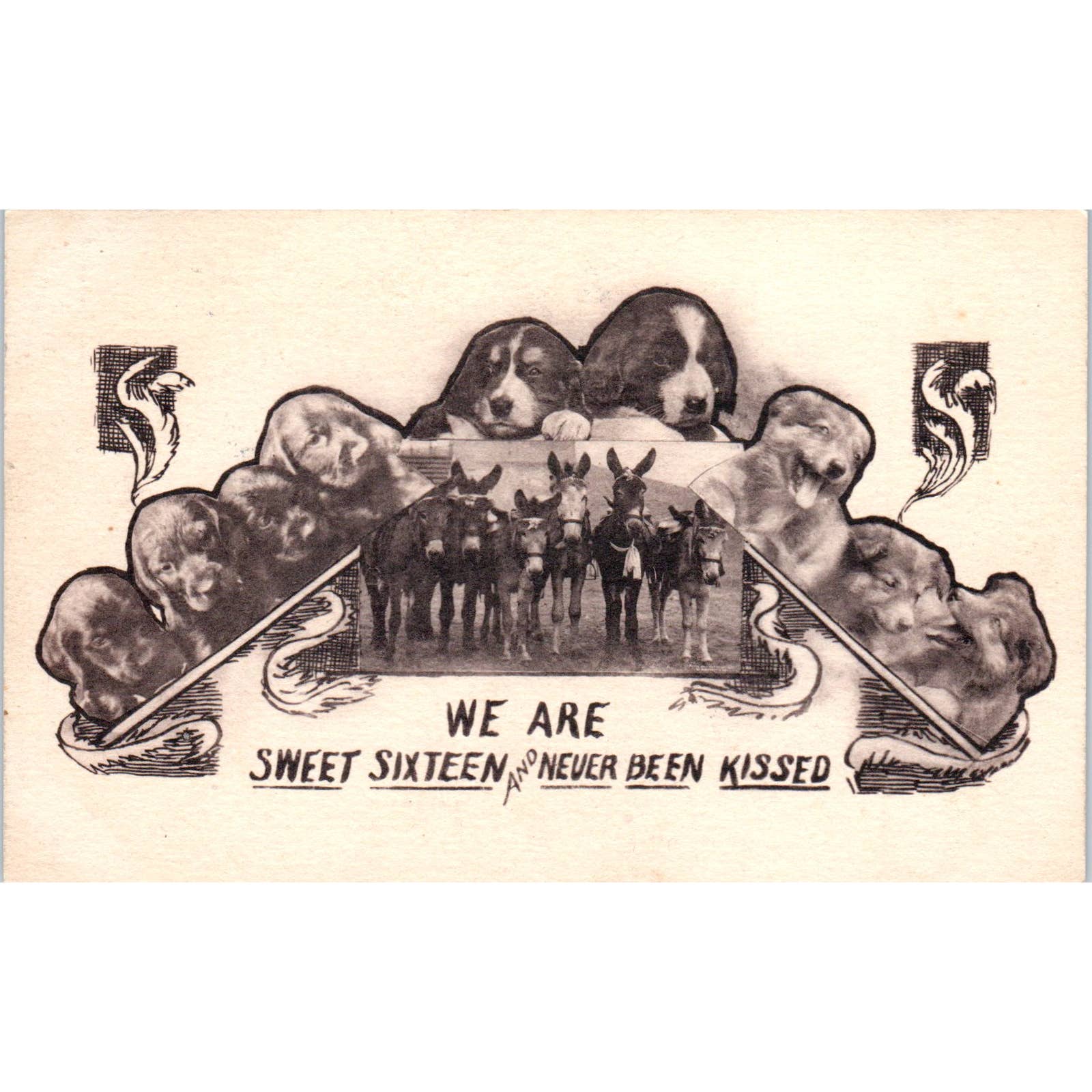 c1910 Comic Postcard Sweet 16 & Never Been Kissed Donkeys & Puppies Photos EA3