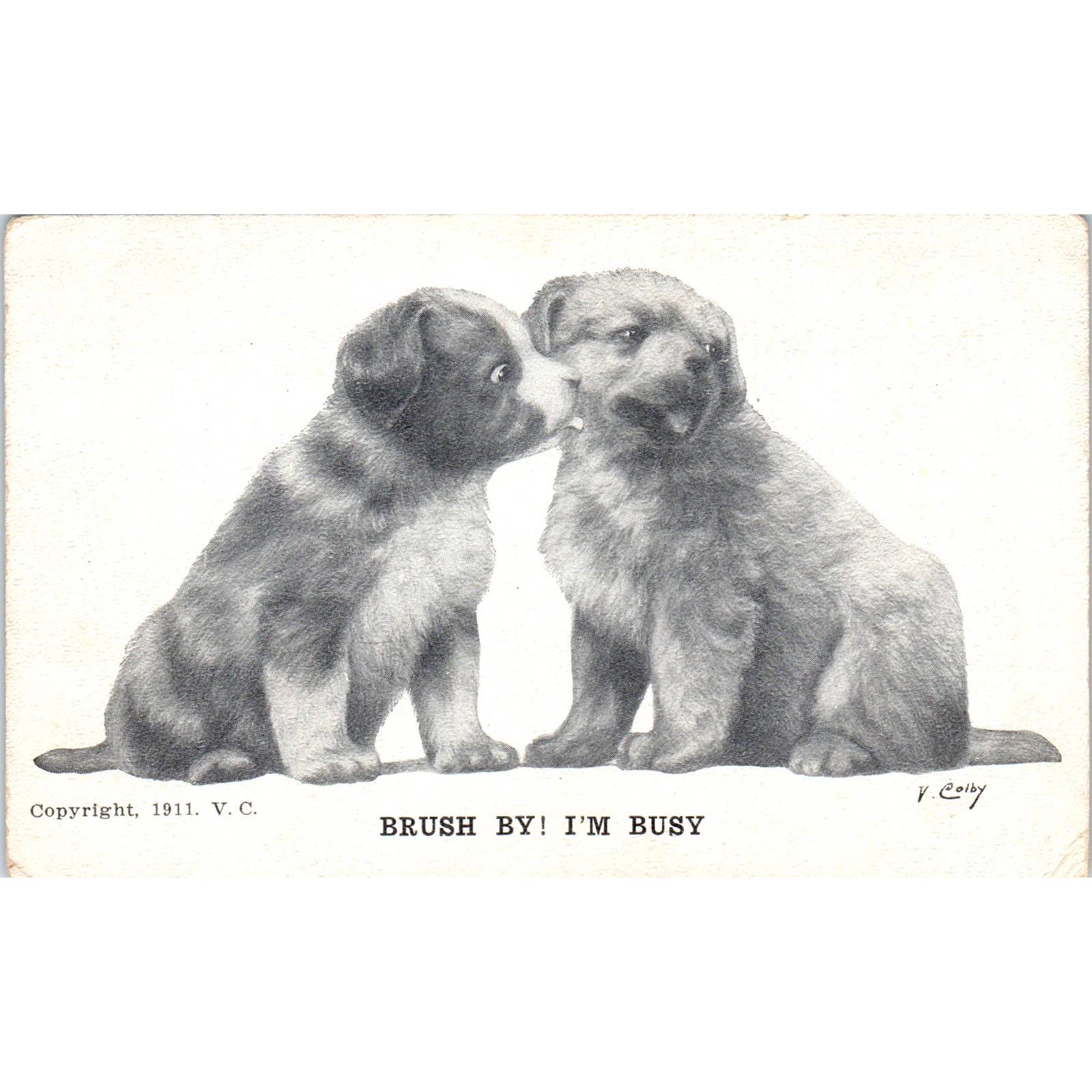 c1910 Comic Postcard V Colby Black And White Dogs Puppies Brush By! I'm Busy EA3