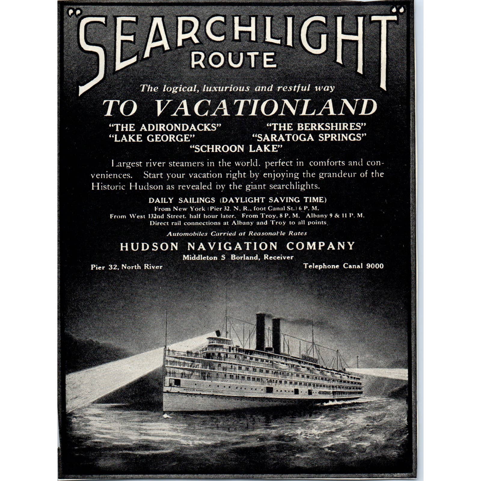 c1920 Harper's Ad - Hudson Navigation Company Steamer Searchlight Route TF6-1