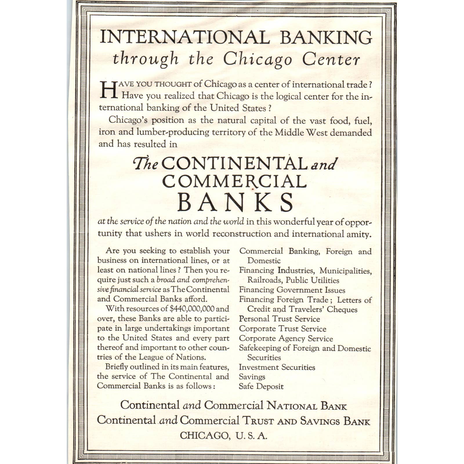 c1920 Harper's Magazine Ad - Continental and Commercial Bank Chicago EA3