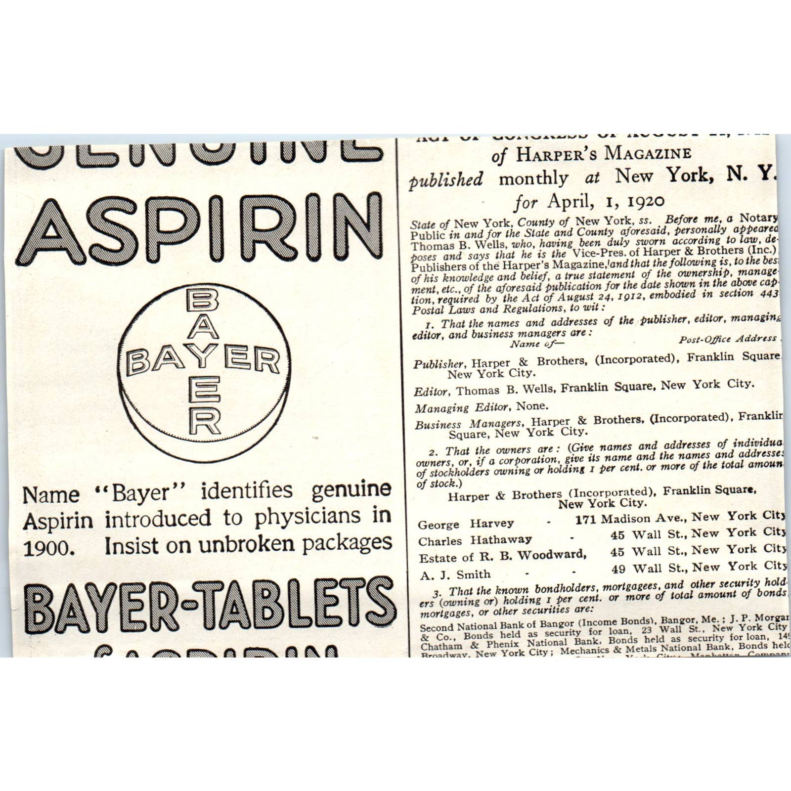 Original print ad taken from a c1920 Harper's Magazine. See pics for condition.