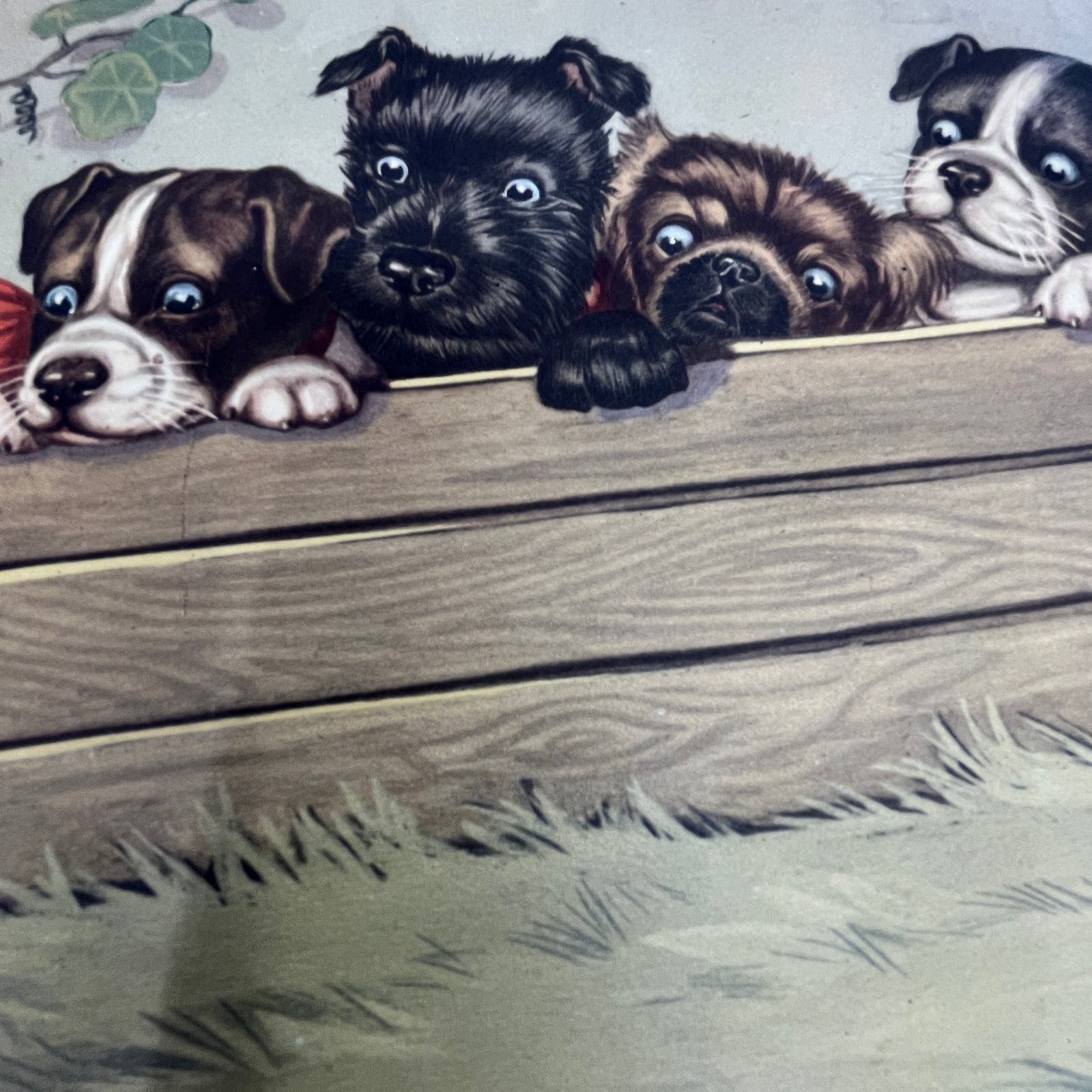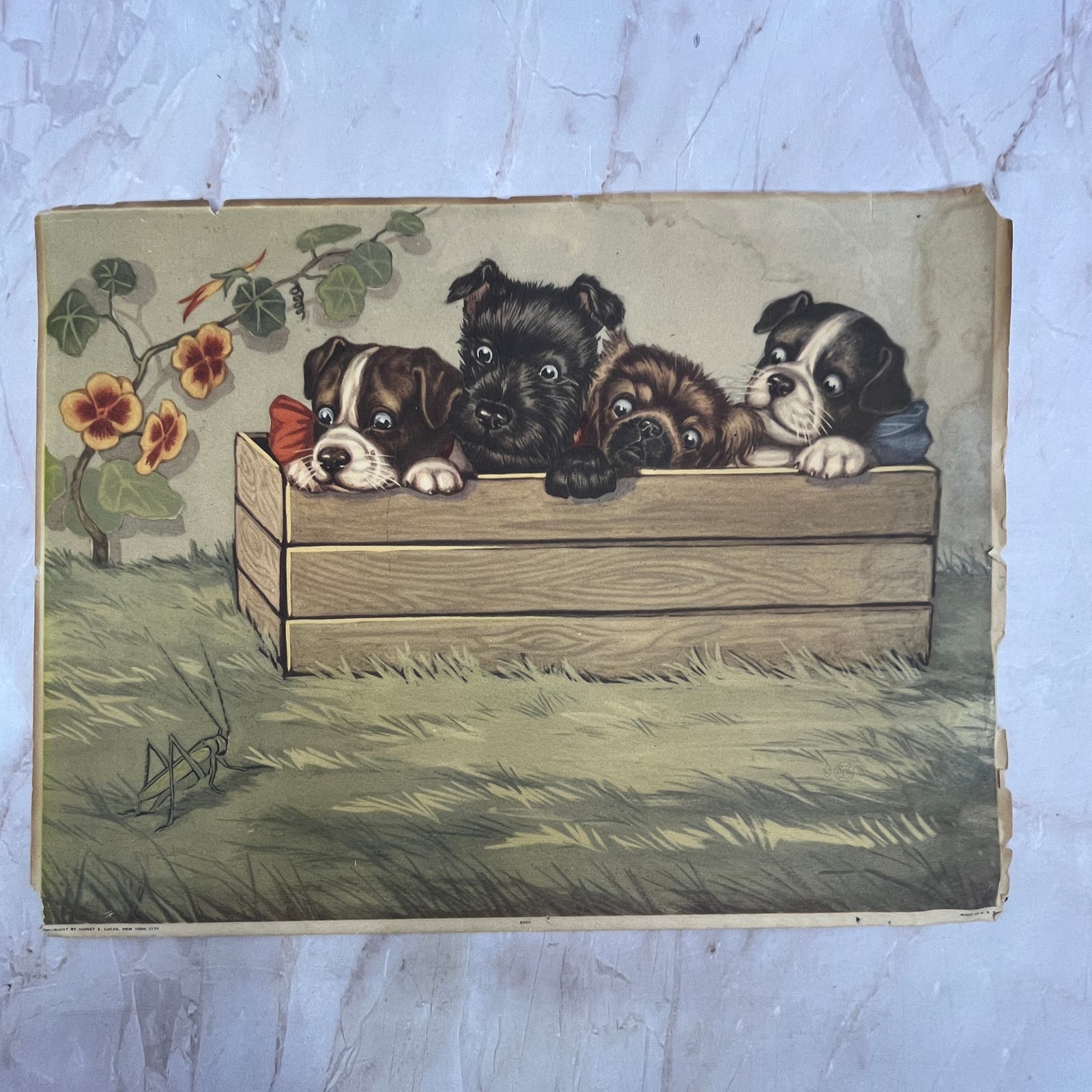 c1950 Kitsch Crate of Puppy Dogs Novotint Art Print Sidney Z. Lucas 9x12 FL6-3