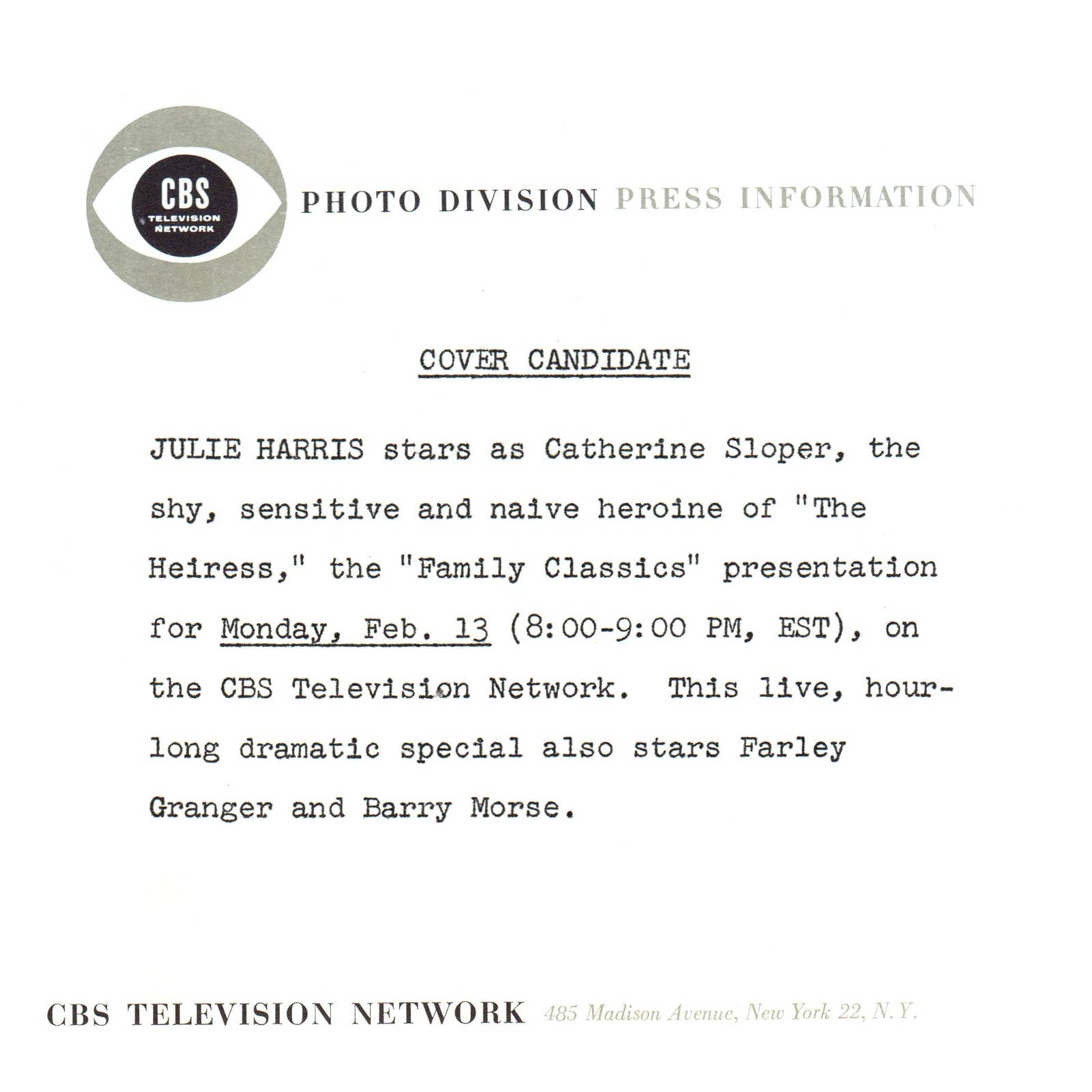 c1960 Press Photo Julie Harris Family Classics The Heiress CBS TJ7-2