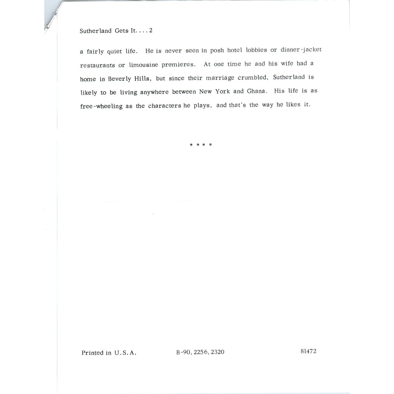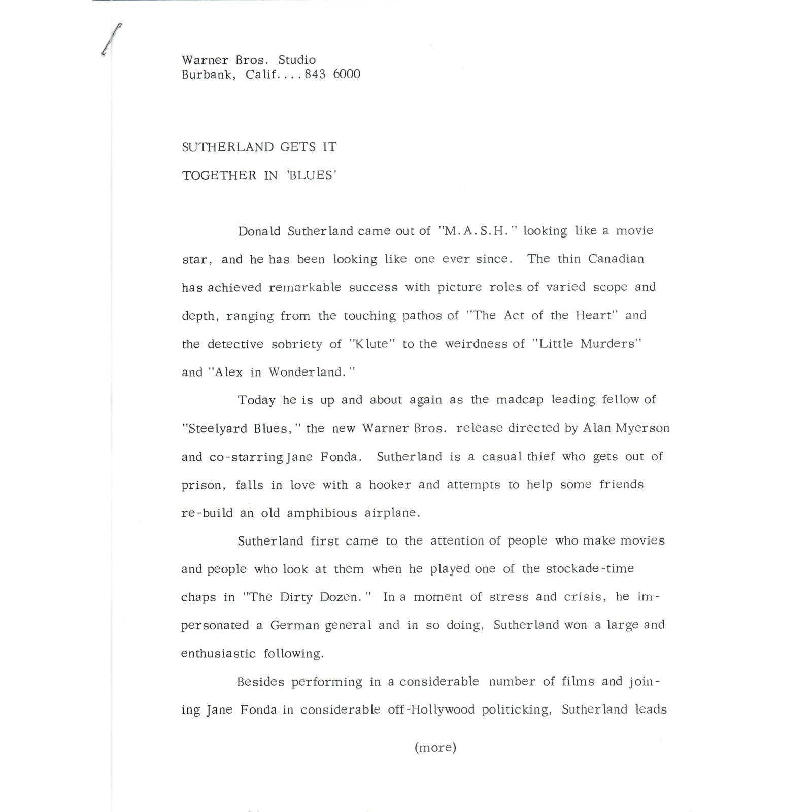 c1973 Warner Brothers Studio Donald Sutherland Promotional Bio Sheet AE6