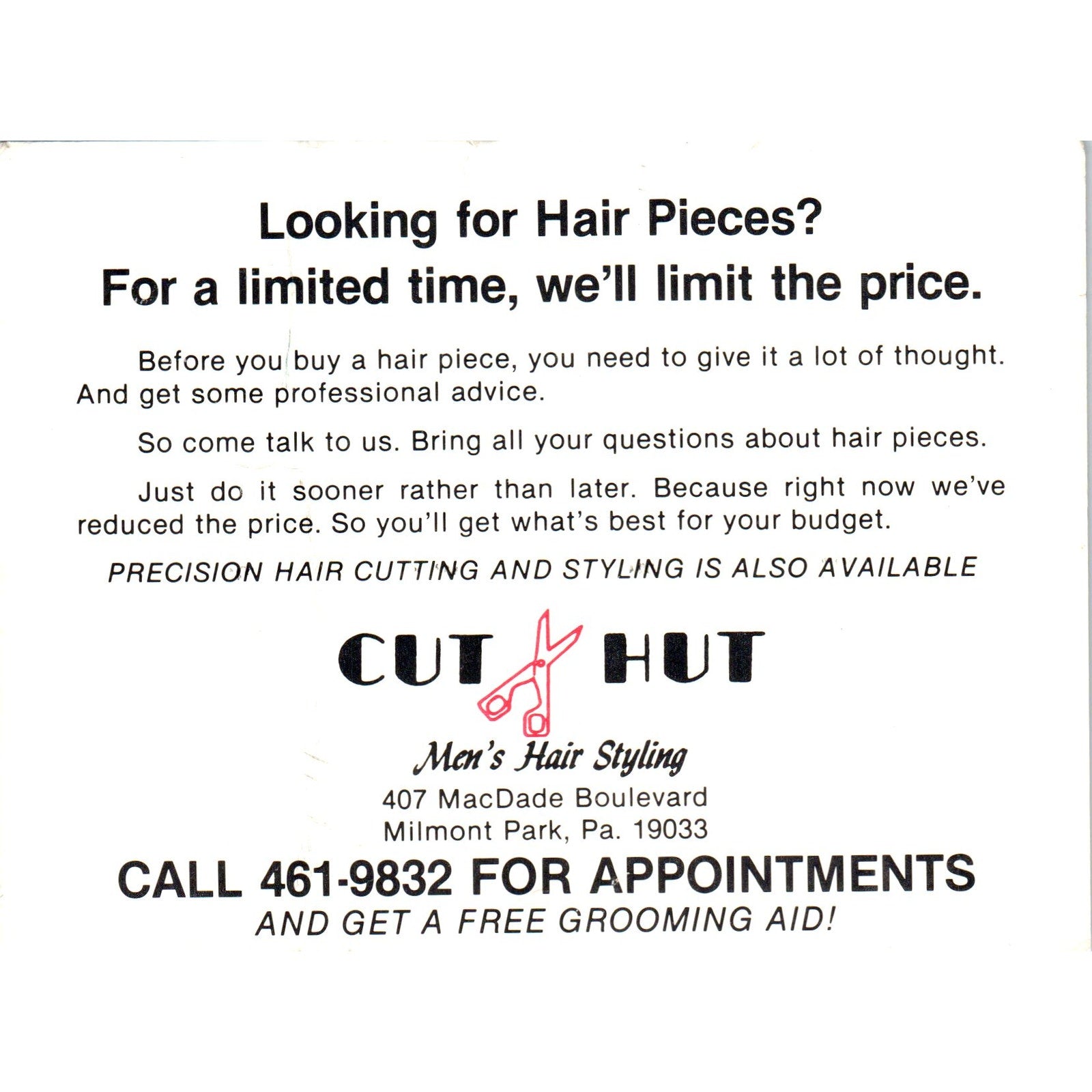 c1980 Cut Hut Men's Hair Styling Hair Pieces Milmont Park PA Postal Card PD7
