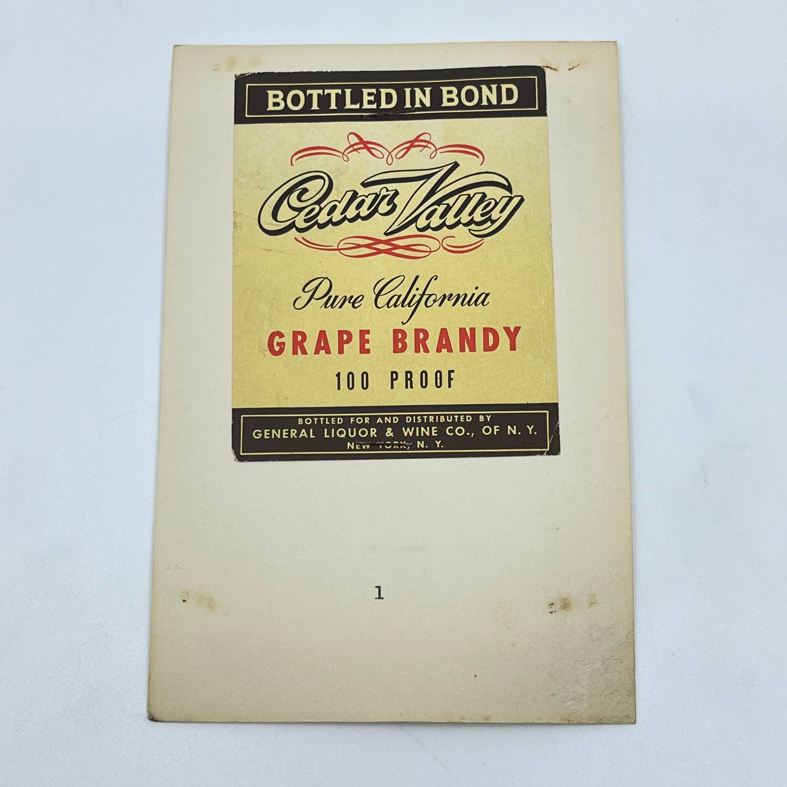 Cedar Valley California Grape Brandy Label General Liquor & Wine Co. New York NY