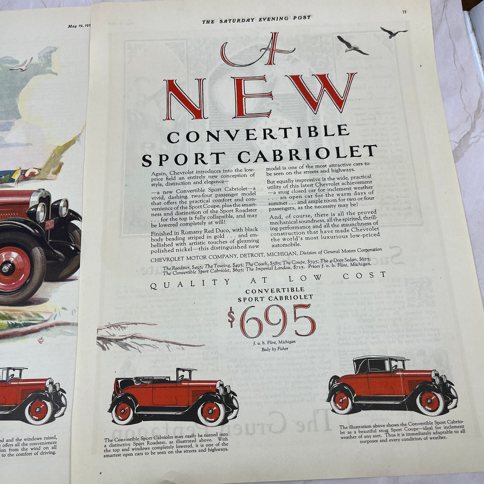 Chevrolet Sport Cabriolet Convertible 2 Pages 1928 Original Magazine Advertisement FL6-8