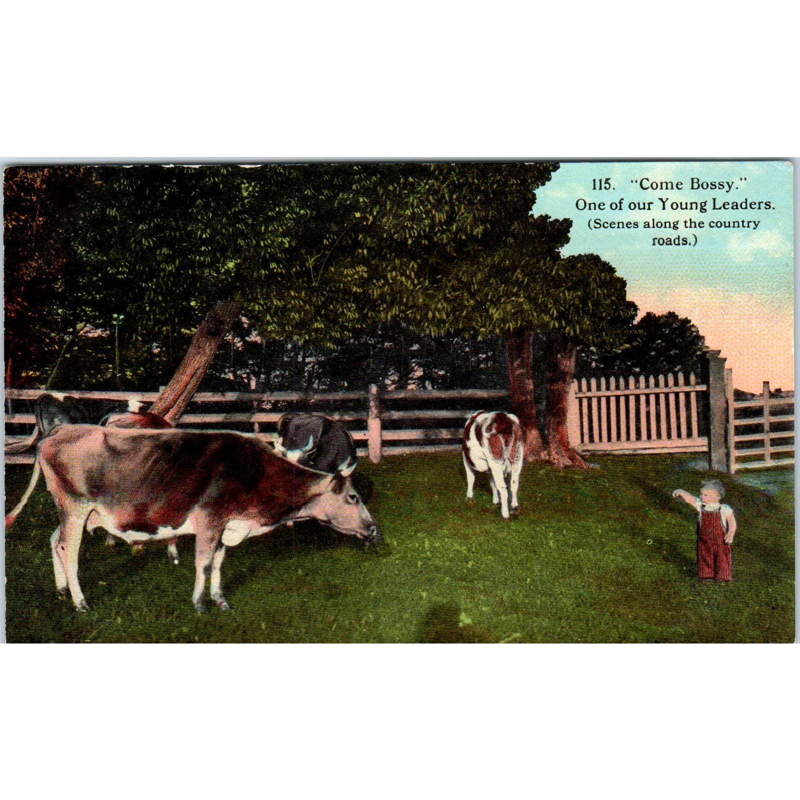 Child Herding Cow "Come Bossy" c1910 Original Postcard TK1-21
