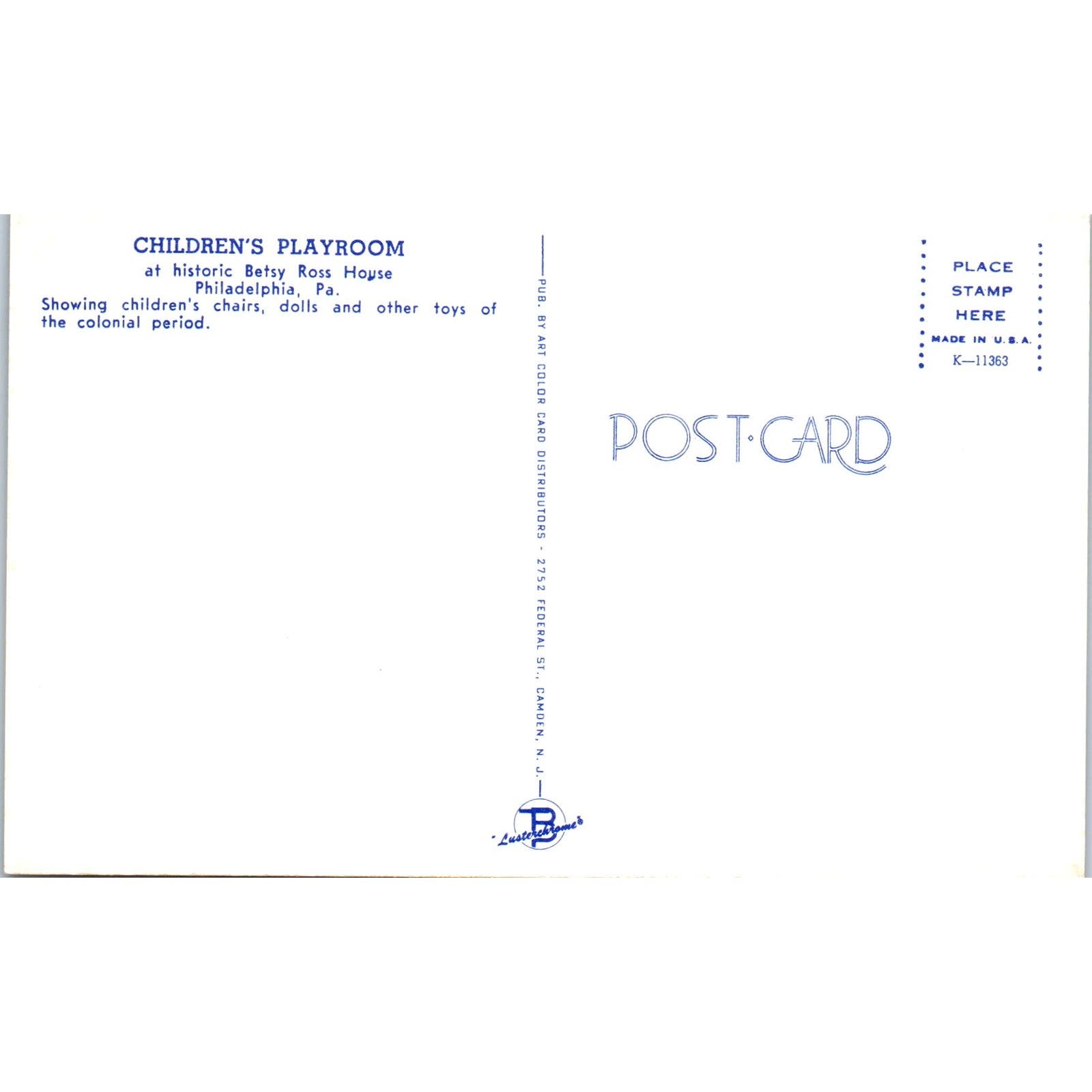 Children's Playroom & Dolls Betsy Ross House Philadelphia Original Postcard PB7