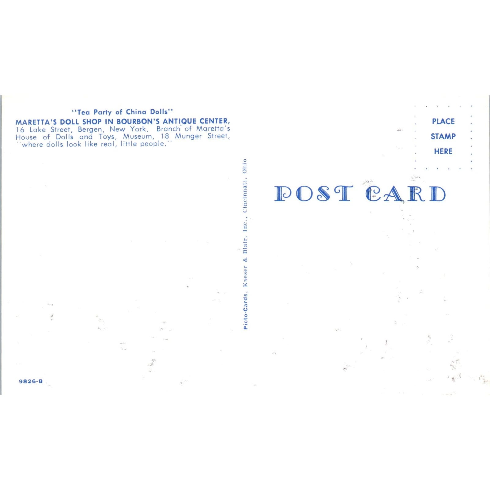 China Doll Tea Party Maretta's Doll Shop Bourbon's Antique Center Bergen NY Original Postcard PB9