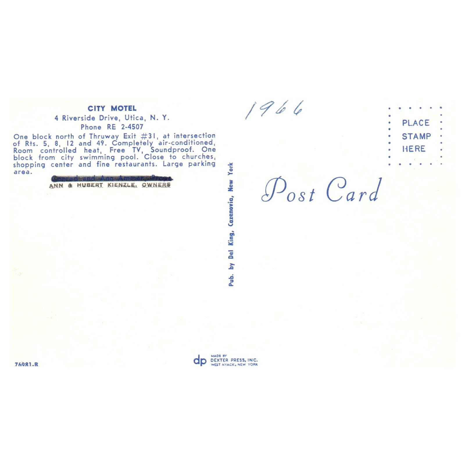 City Motel Riverside Drive Utica NY Ann & Hubert Kienzle 1966 - Postcard TJ8-2