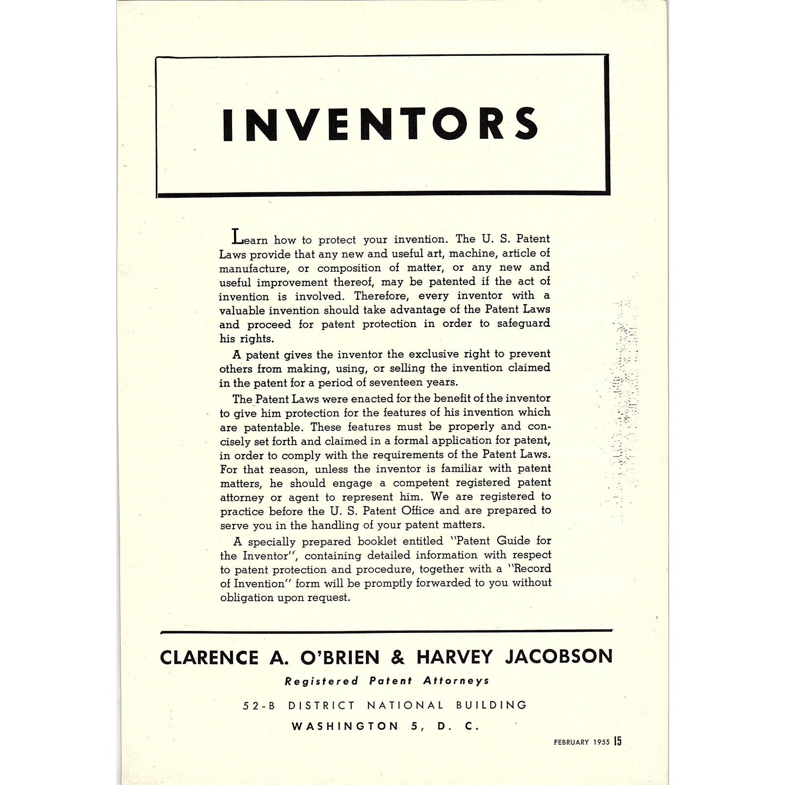 Clarence A. O'Brien & Harvey Jacobson Patent Attorneys 1955 Ad AG1-7
