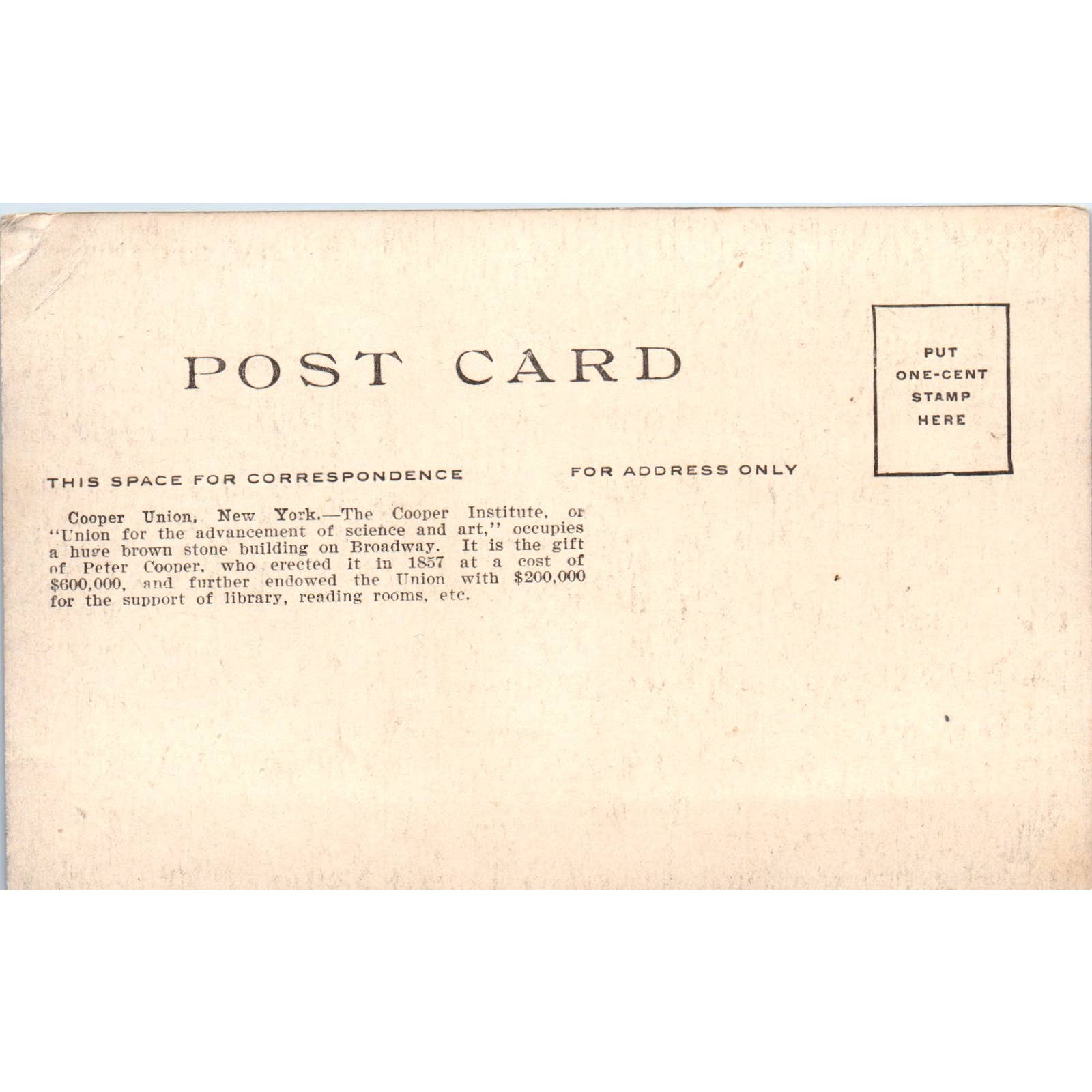 Cooper Union New York c1910 Original Postcard TK1-27