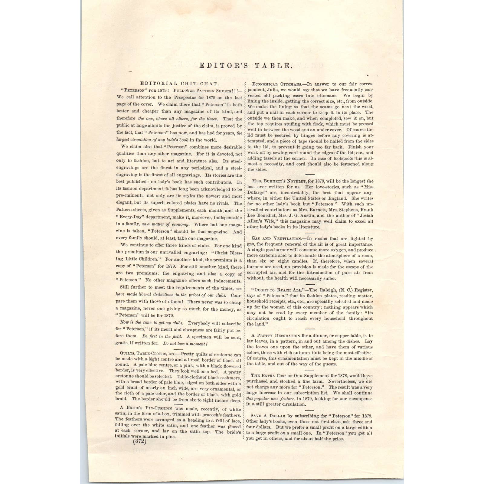 This measures roughly 5x8. Pulled from a 1878 Issue of Peterson's Magazine. See pics for condition. Measurements are approximate.