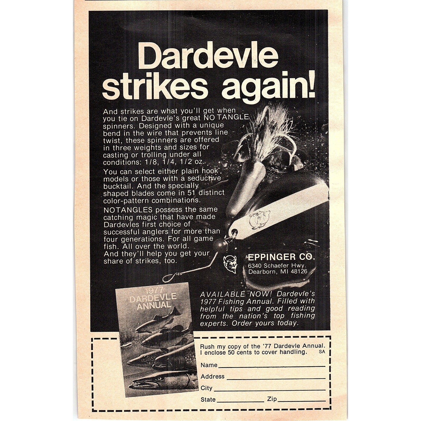 Dardevle Fishing Lures Eppinger Co Dearborn MI 1977 Ad AF6-5