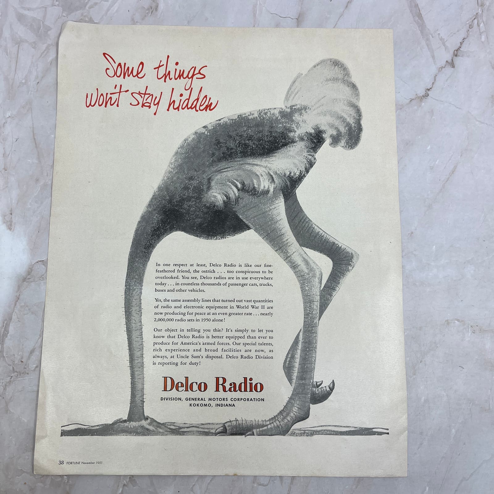 Delco Radio Ostrich Head Buried Kokomo Indiana 1951 Magazine Ad FL6-10