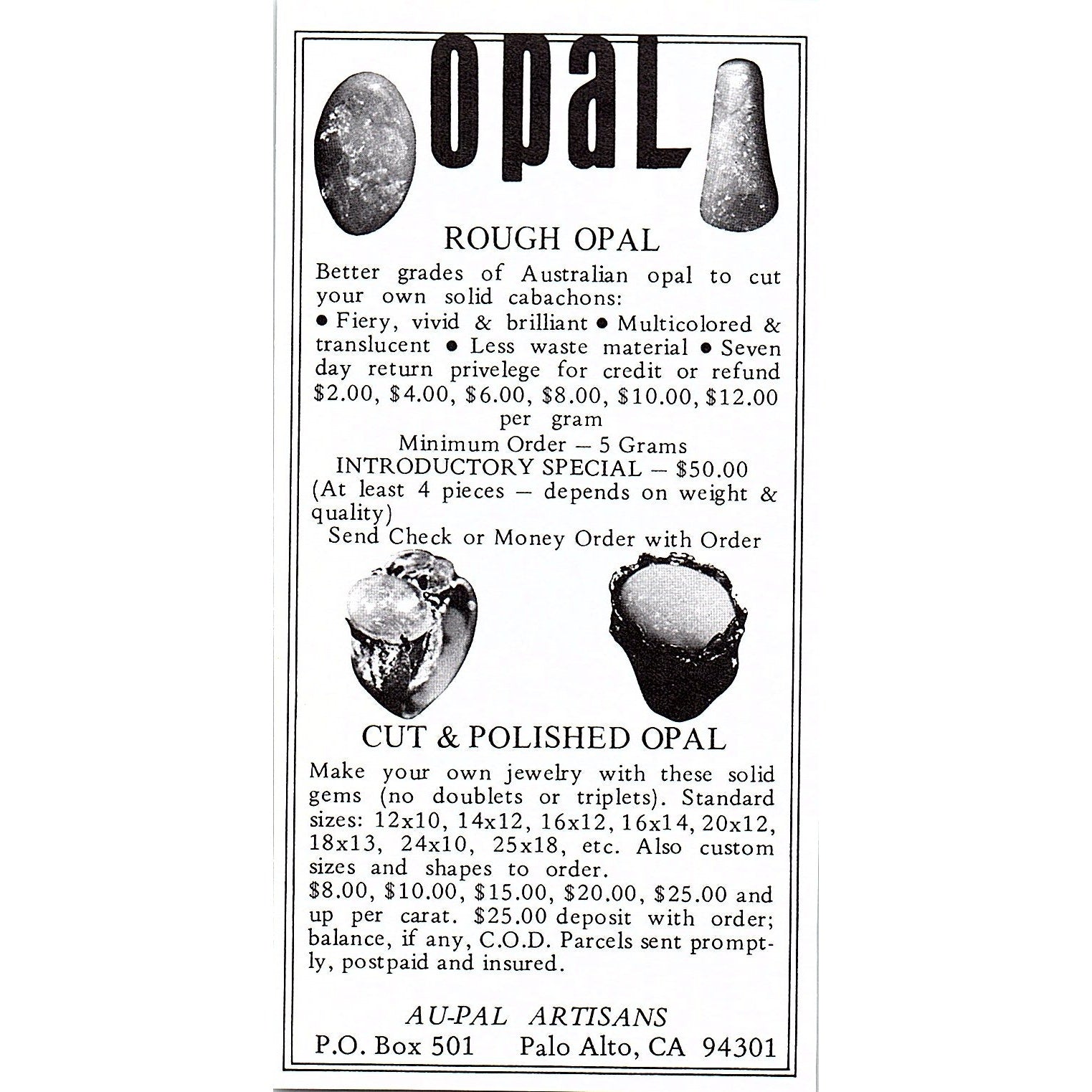 Measures approx 2.5x5". This is a SMALL Ad, size is approximate. Original piece taken from a 1972 Lapidary Journal magazine. Has regular wear and tear you would expect from a piece this age. See pics for condition.