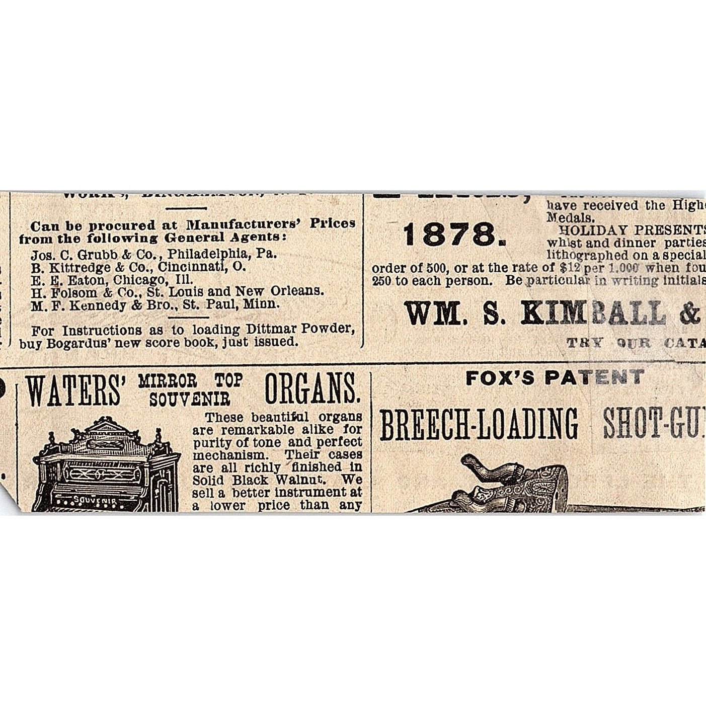 THIS IS A SMALL AD Approx 2x4.5". Original piece taken from 1878 Forest & Stream Rod & Gun Magazine. Paper is fragile and can flake off easily. May have small tears, chunks missing, or other blemishes you would expect from something this age. See pics for condition.