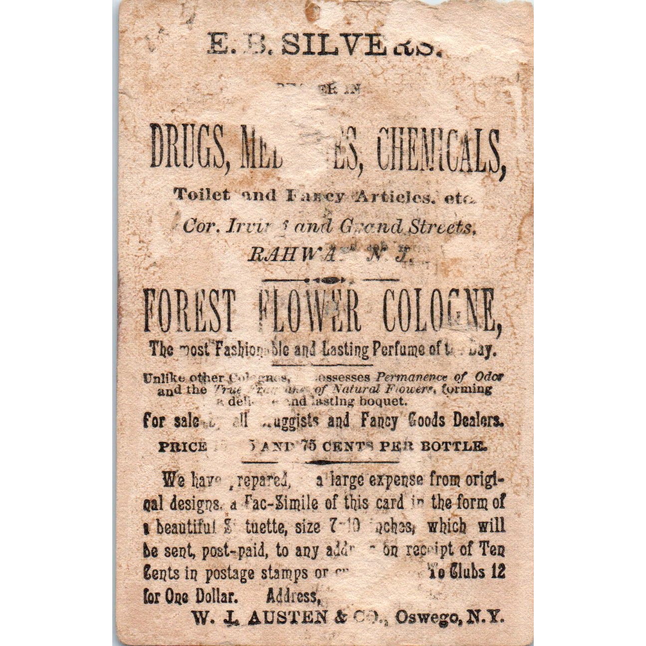 E.B. Silvers Pharmacy Rahway NJ Forest Flowers c1880 Victorian Trade Card AE5