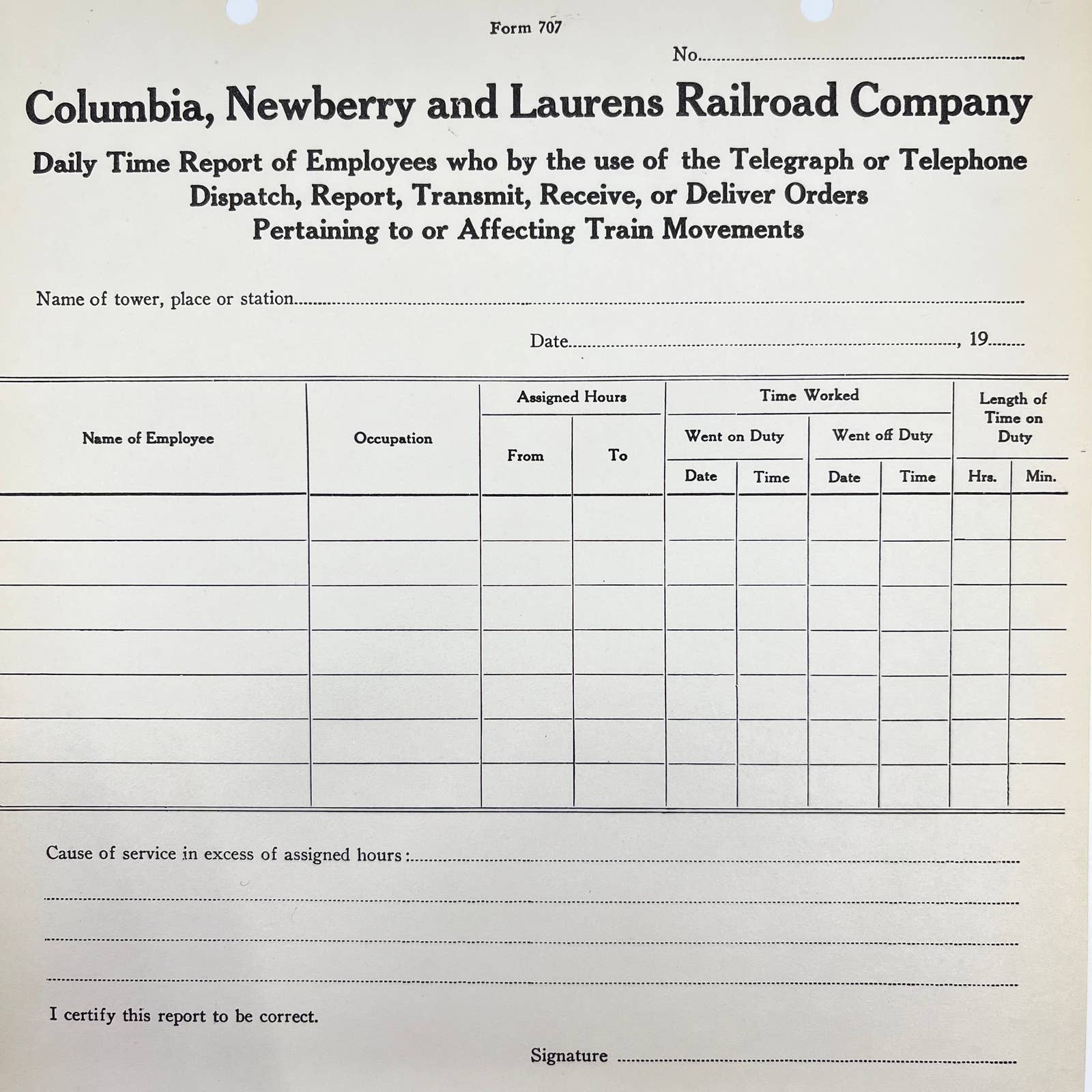 Early 1900s Columbia, Newberry & Laurens Railroad RR Co Employee Time Report AB5