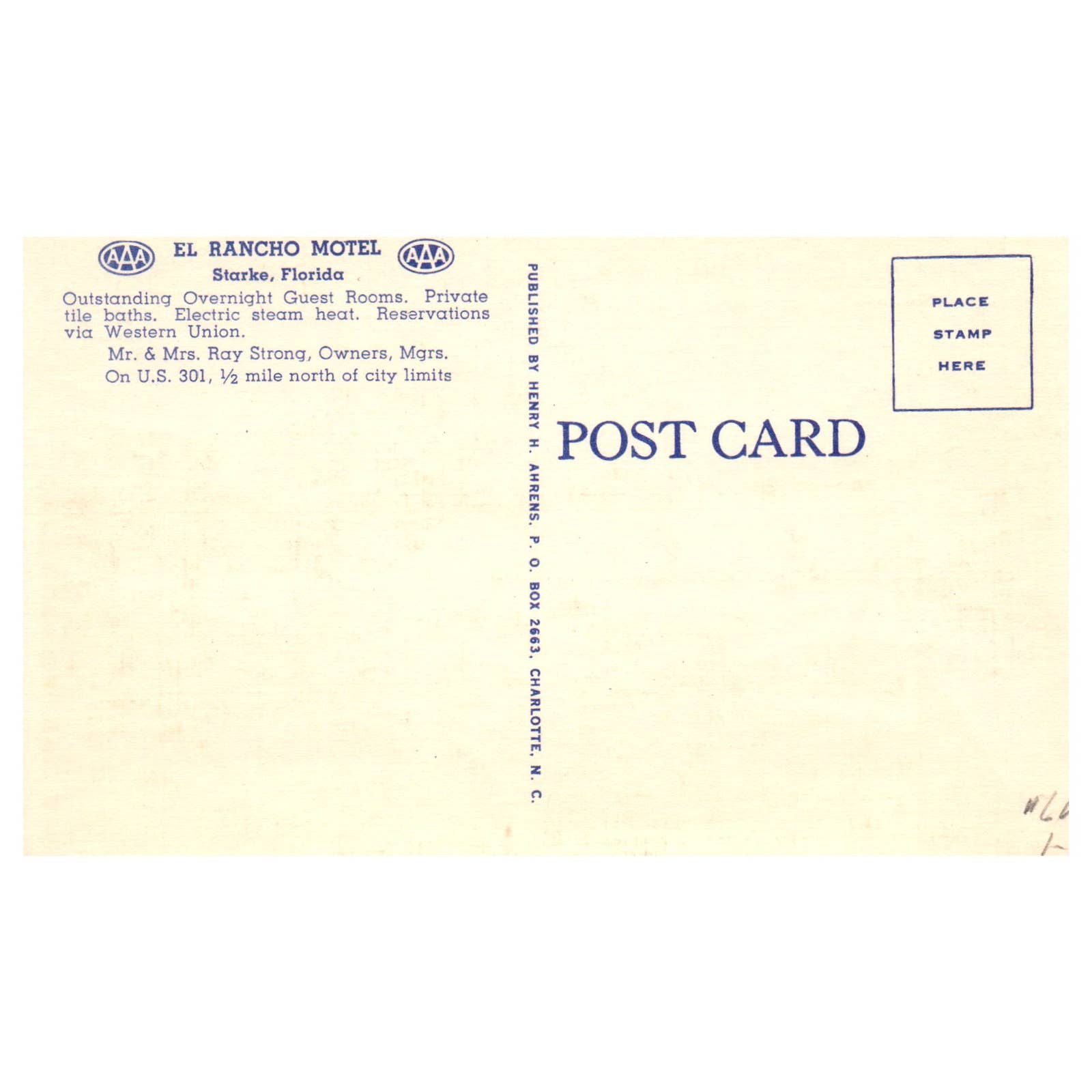 El Rancho Motel Starke Florida AAA Mr & Mrs Ray Strong - Postcard TJ8-1