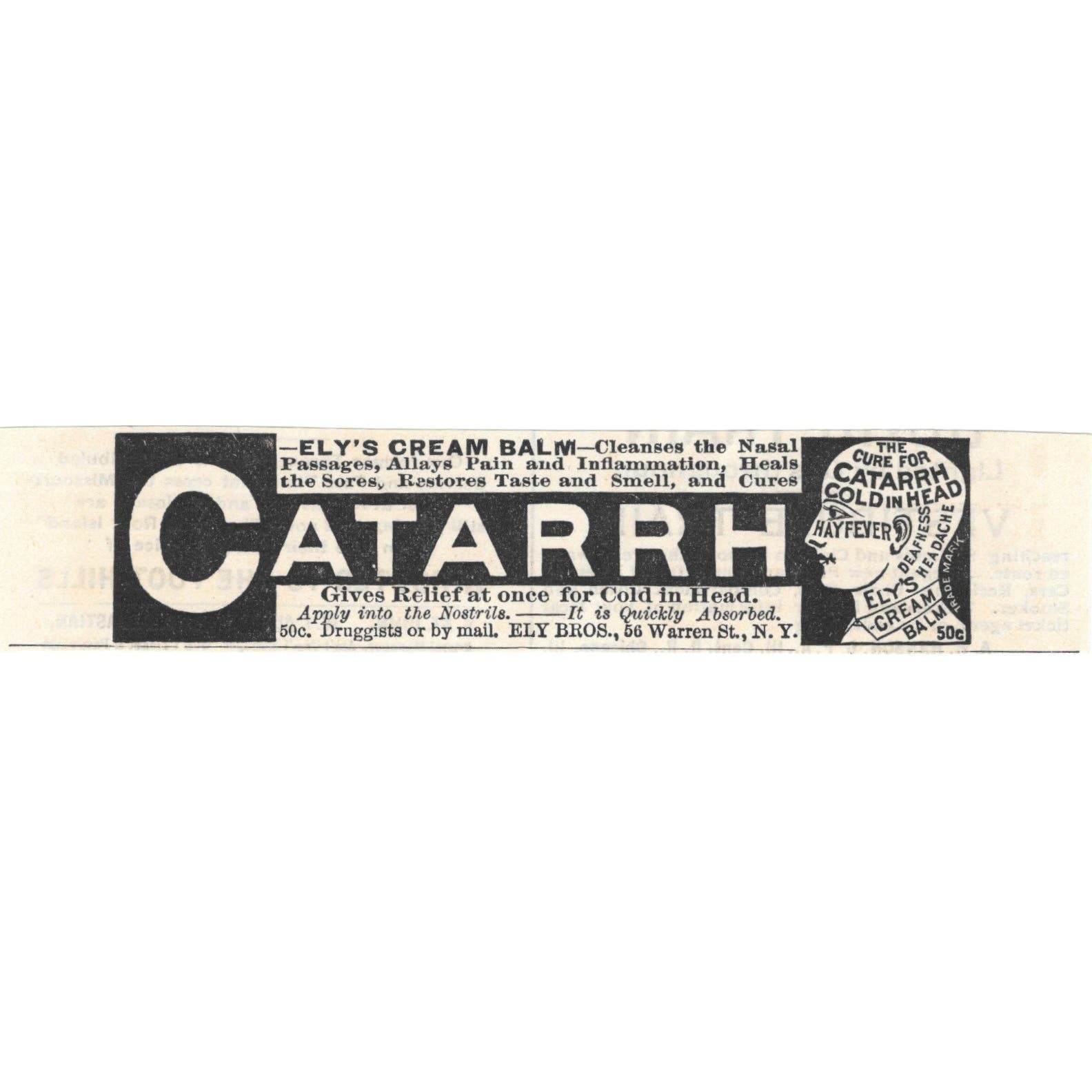 Ely's Cream Balm for Catarrh Ely Bros NY c1890 Victorian Ad AE8-CH13