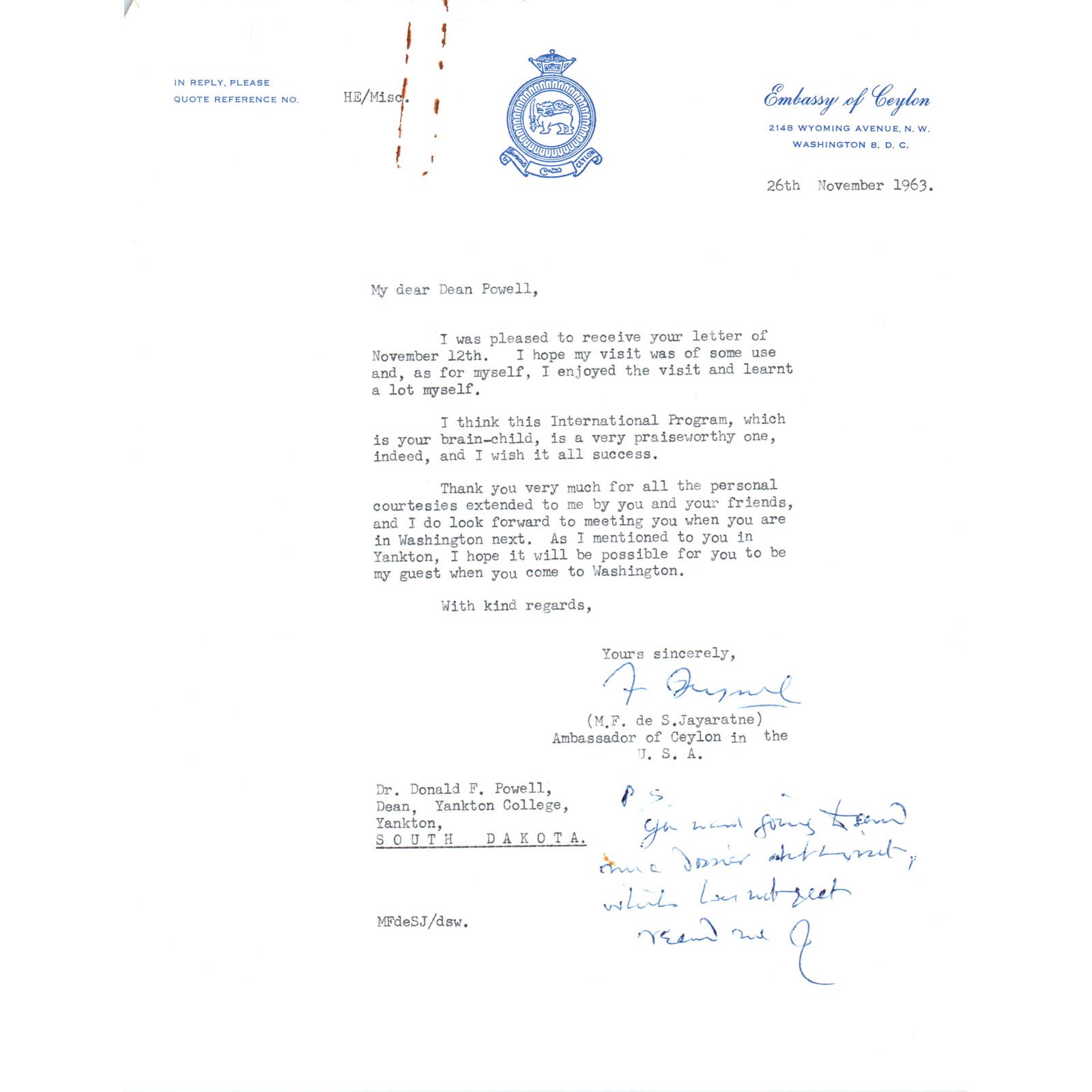Embassy of Ceylon Official Letterhead Memo M.F. de S.Jayaratne Nov 1963 TK1-P11