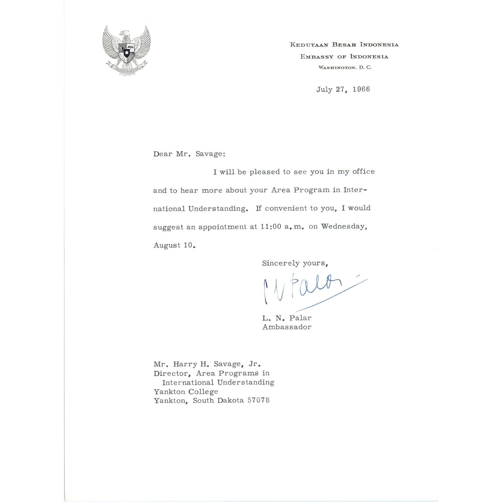 Embassy of Indonesia Official Letterhead Memo L.N. Palar 7/27/66 TK1-P10