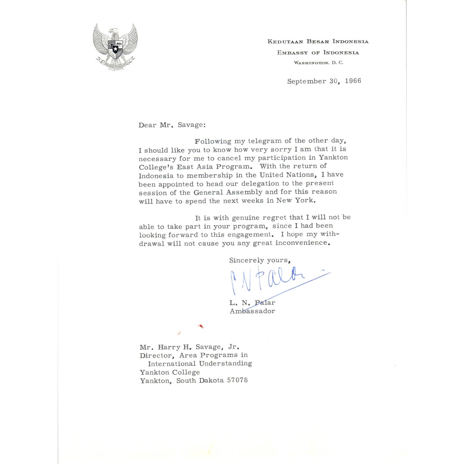 Embassy of Indonesia Official Letterhead Memo L.N. Palar 9/30/66 TK1-P10