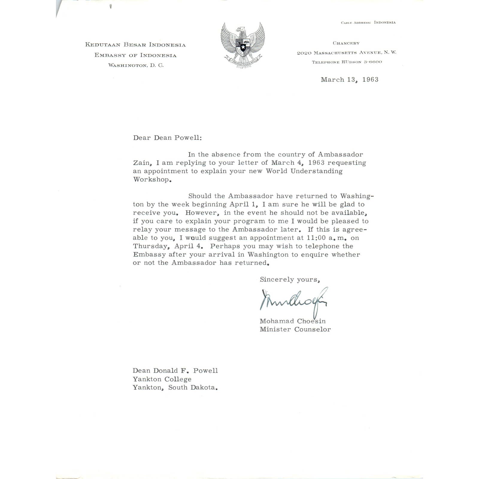 Embassy of Indonesia Official Letterhead Memo Mohamad Choesin 3/13/63 TK1-P10