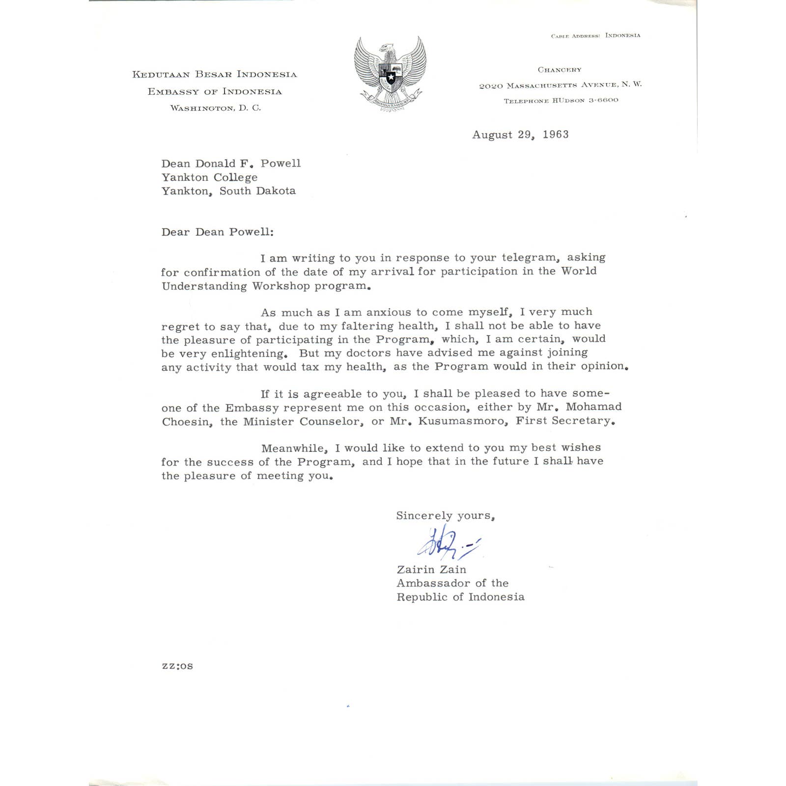 Embassy of Indonesia Official Letterhead Memo Zairin Zain 8/29/63 TK1-P10