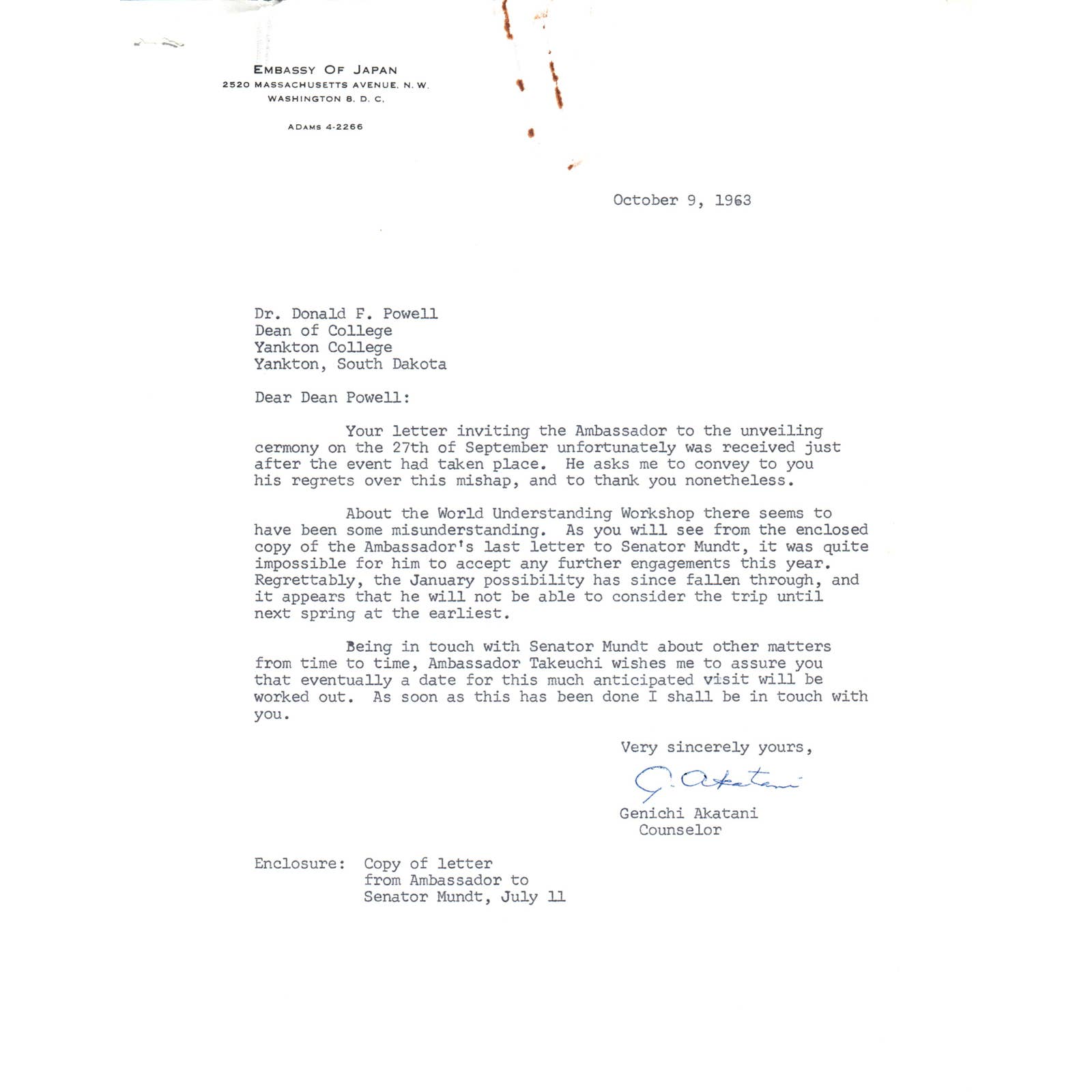 Embassy of Japan Letterhead Memo Genichi Akatani 10/9/63 TK1-P9
