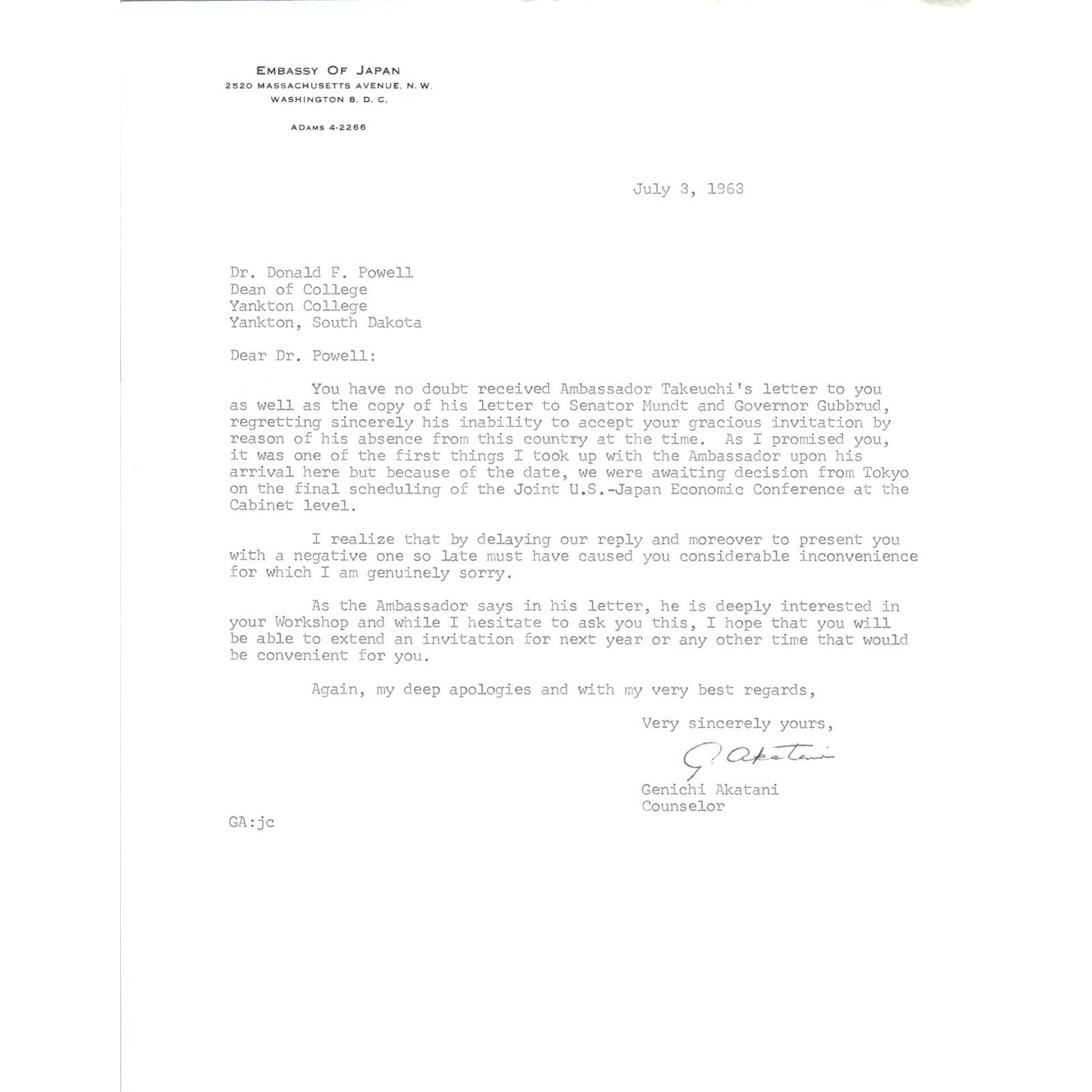 Embassy of Japan Letterhead Memo Genichi Akatani 7/3/63 TK1-P9