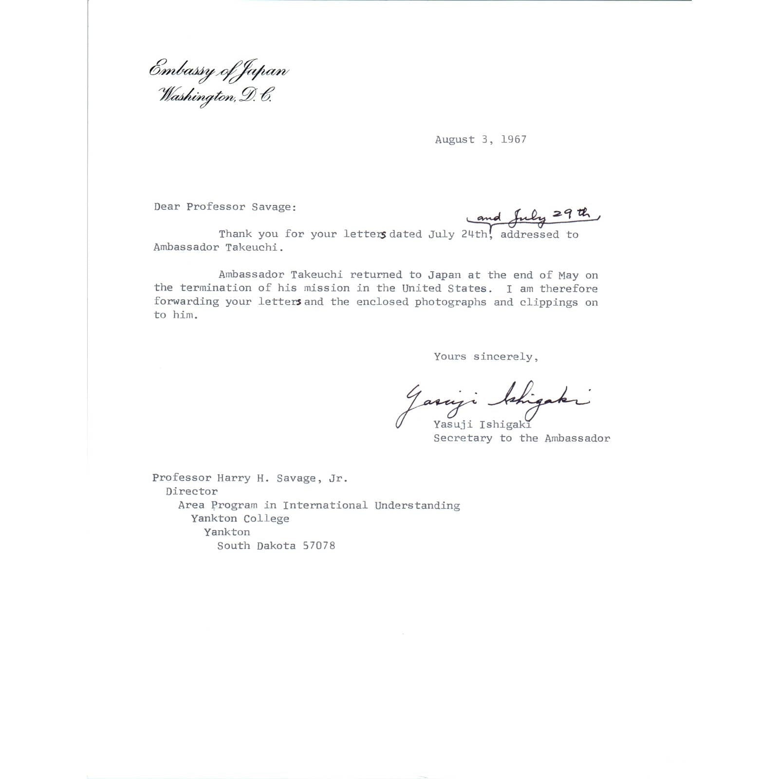 Embassy of Japan Letterhead Memo Yasuji Ishigaki 8/3/67 TK1-P9