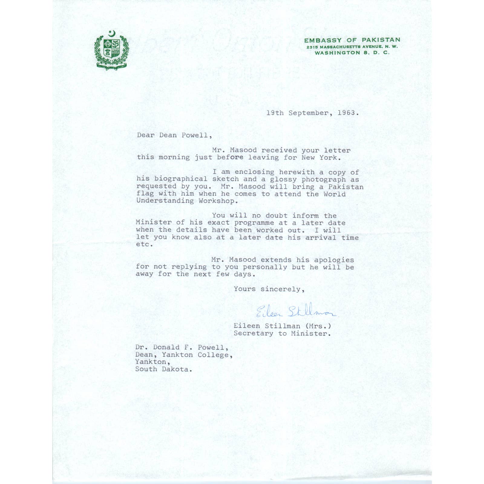 Embassy of Pakistan Official Letterhead Memo Eileen Stillman 1963 TK1-P10
