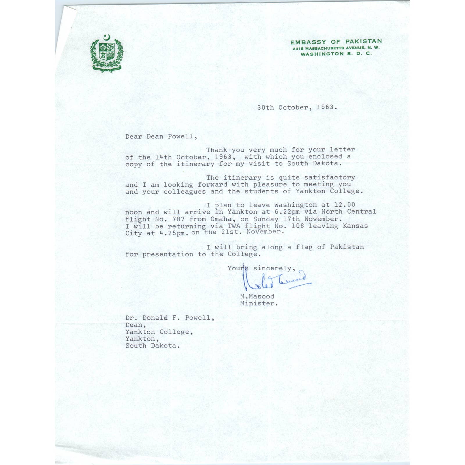Embassy of Pakistan Official Letterhead Memo M. Masood 1963 TK1-P10
