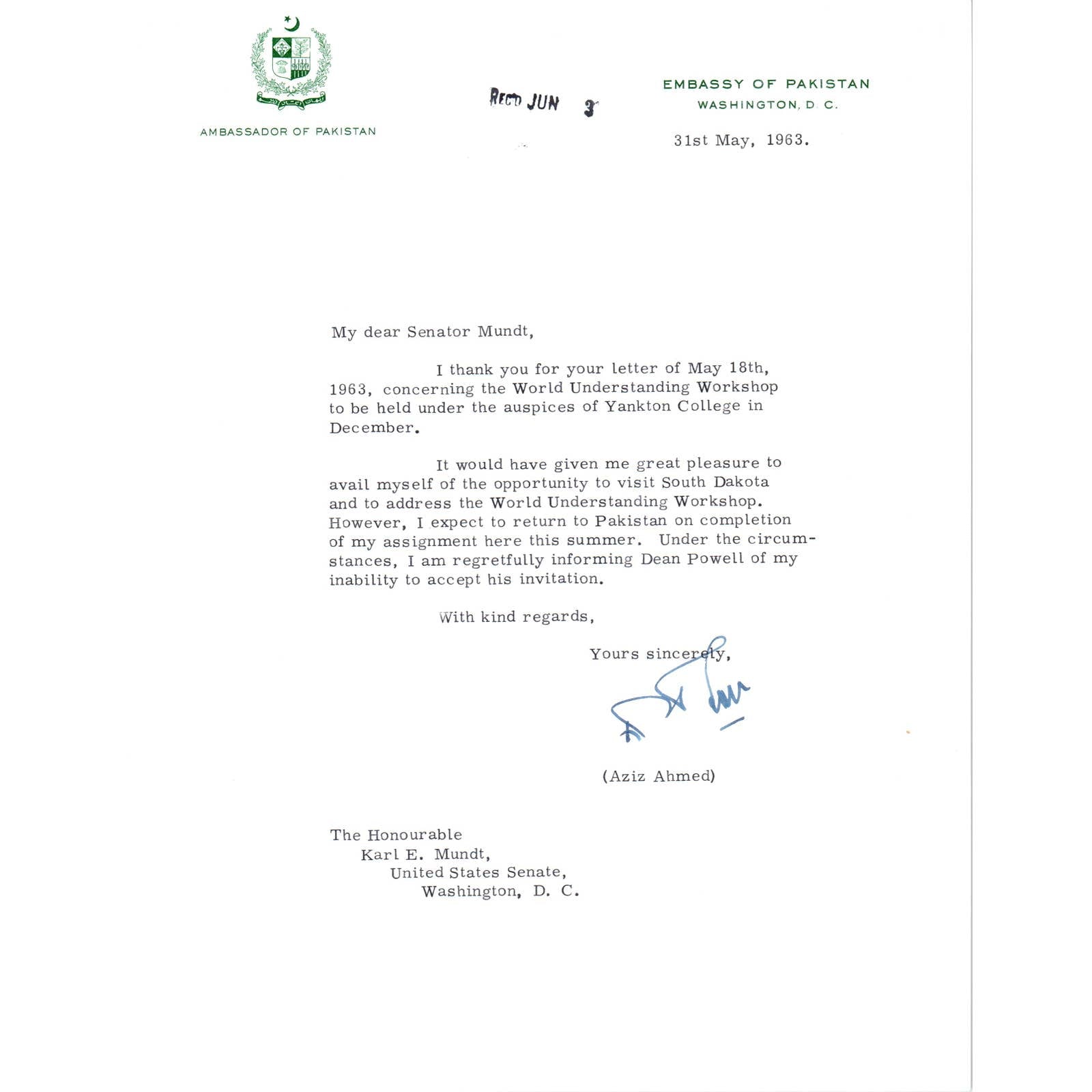 Embassy of Pakistan to US Letterhead Memo Aziz Ahmed 5/31/63 TK1-P9