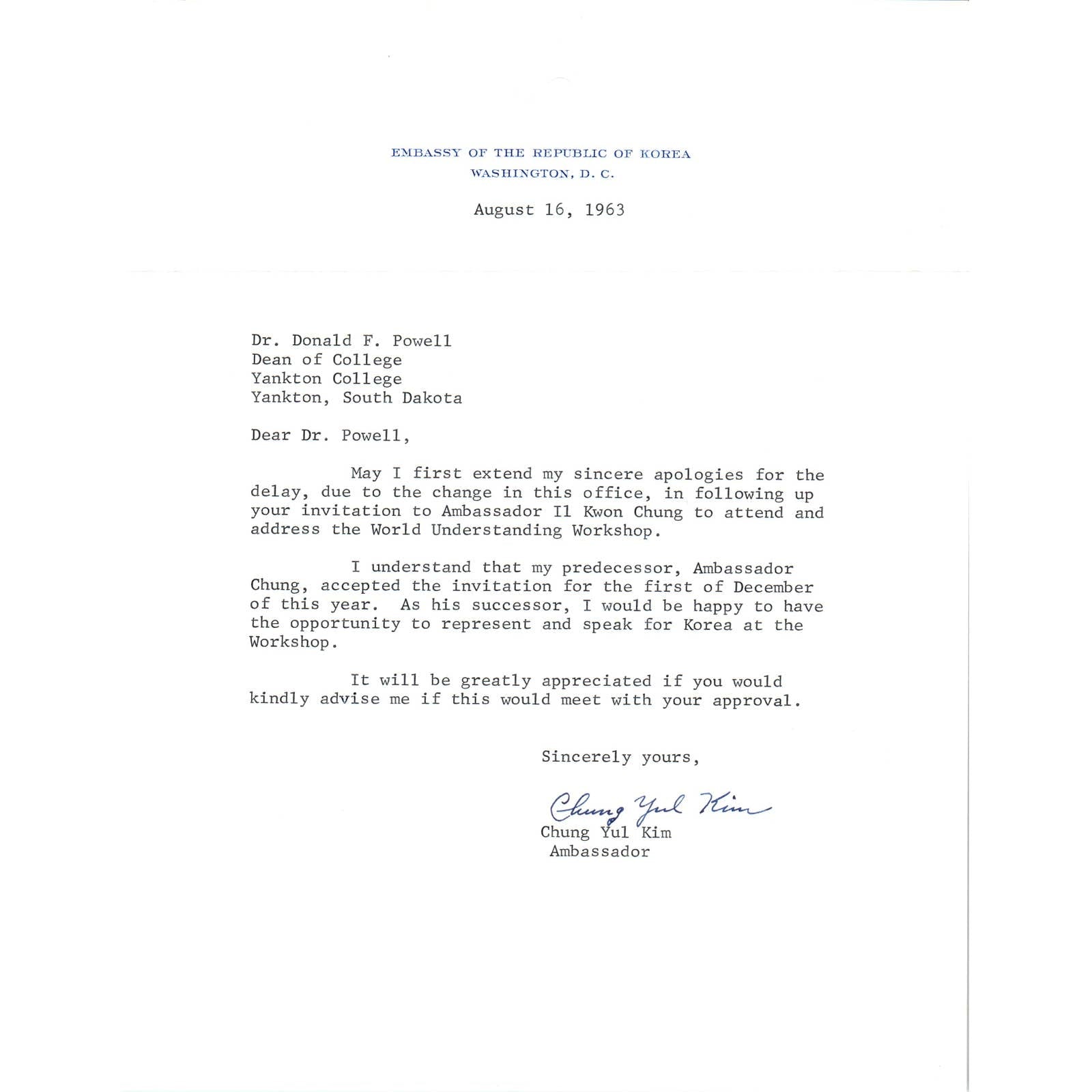 Embassy of Republic of Korea Official Letterhead Chung Yul Kim 8/16/63 TK1-P10