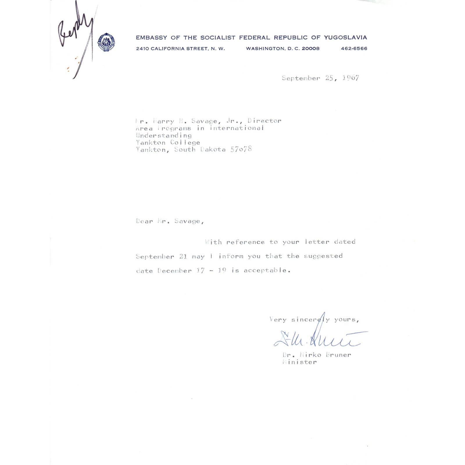 Embassy of the Socialist Federalist Republic of Yugoslavia Letterhead 9/25/67 TK1-P8