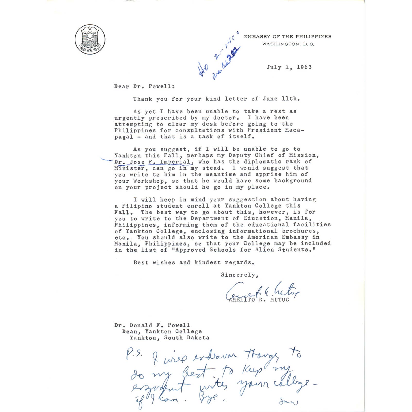Embassy of the Philippines Official Letterhead Amelito R. Mutuc 7/1/63 TK1-P10