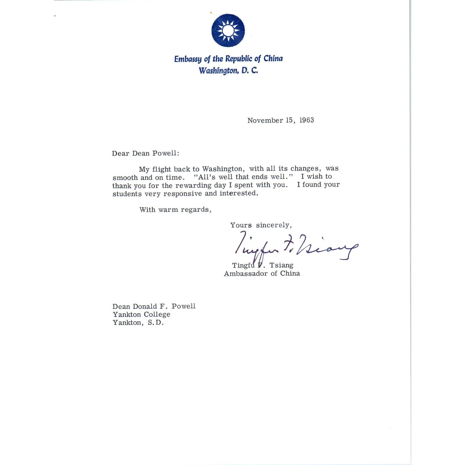 Embassy of The Republic of China Letterhead Memo Tingfu Tsiang 11/15/63 TK1-P11