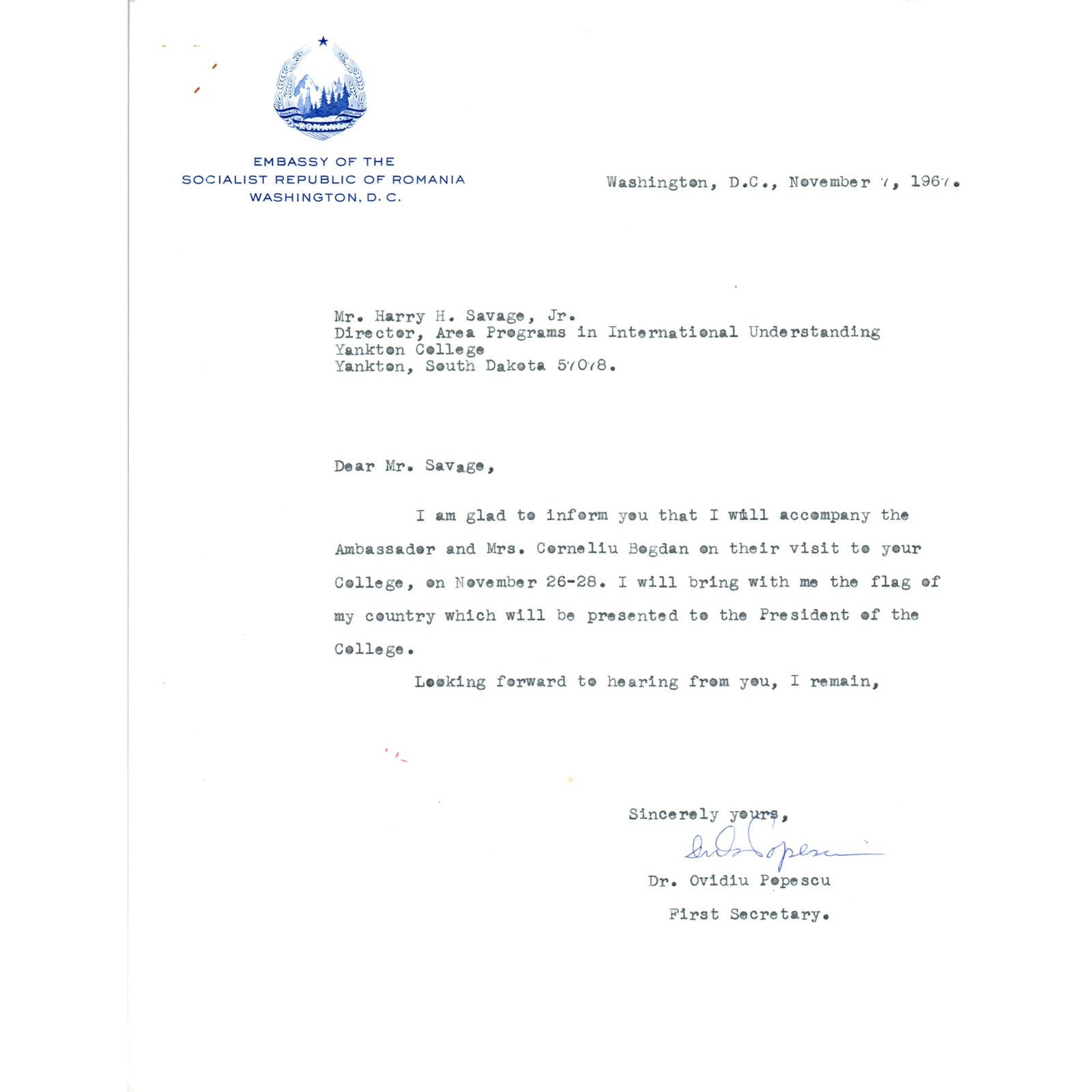 Embassy of The Socialist Republic of Romania Letterhead Memo 11/7/67 TK1-P7