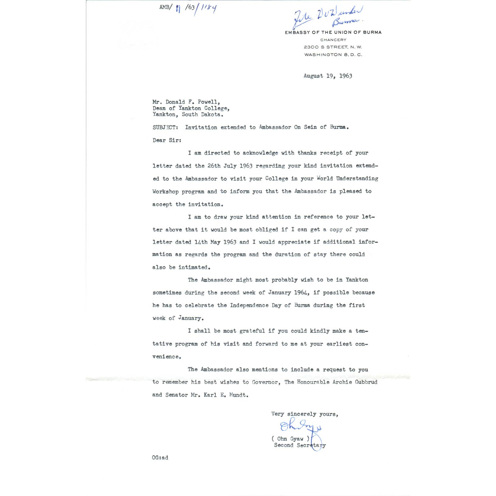 Embassy of The Union of Burma Official Letterhead Memo Ohn Gyaw 1963 TK1-P10