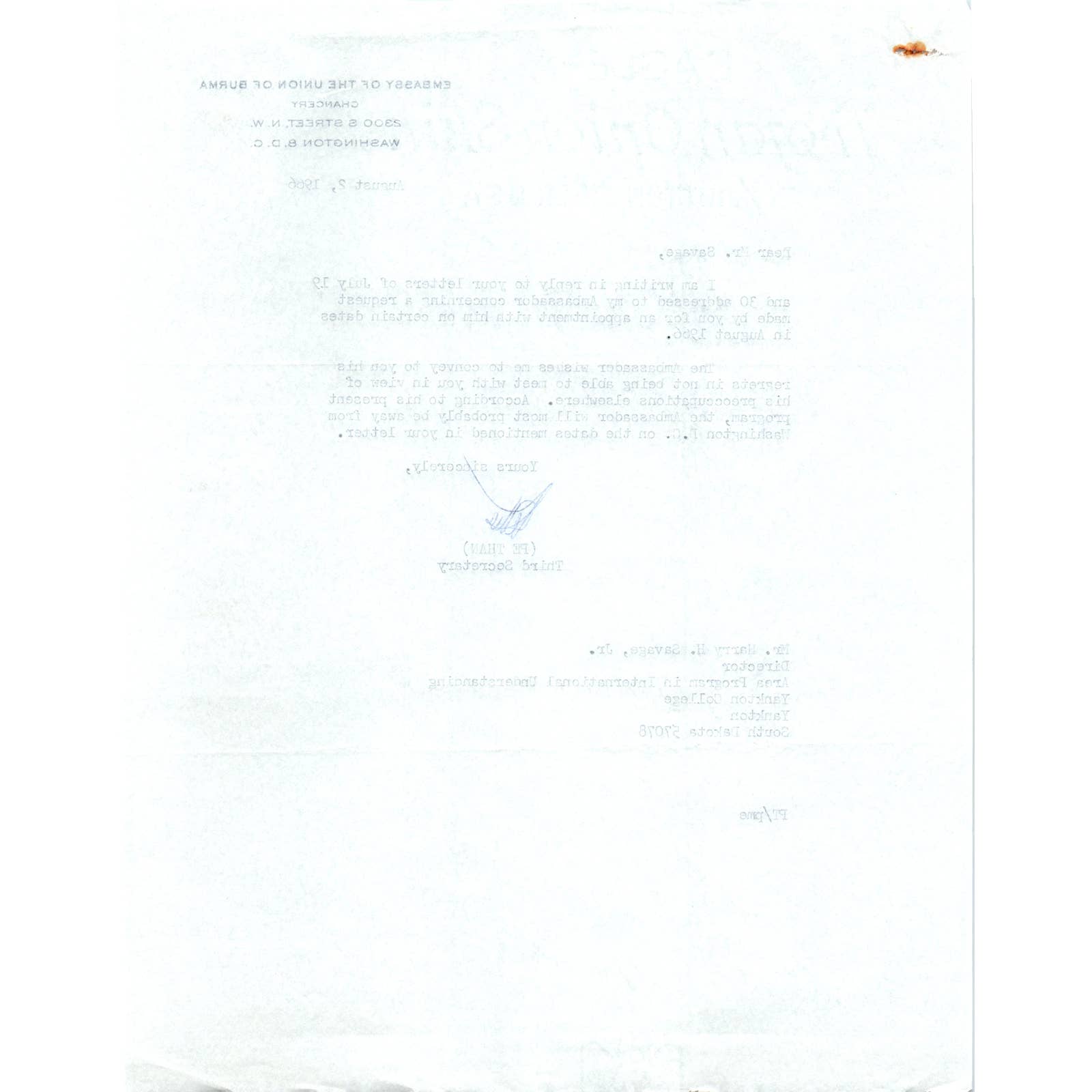 Embassy of the Union of Burma Official Letterhead Memo Pe Than 8/2/66 TK1-P10