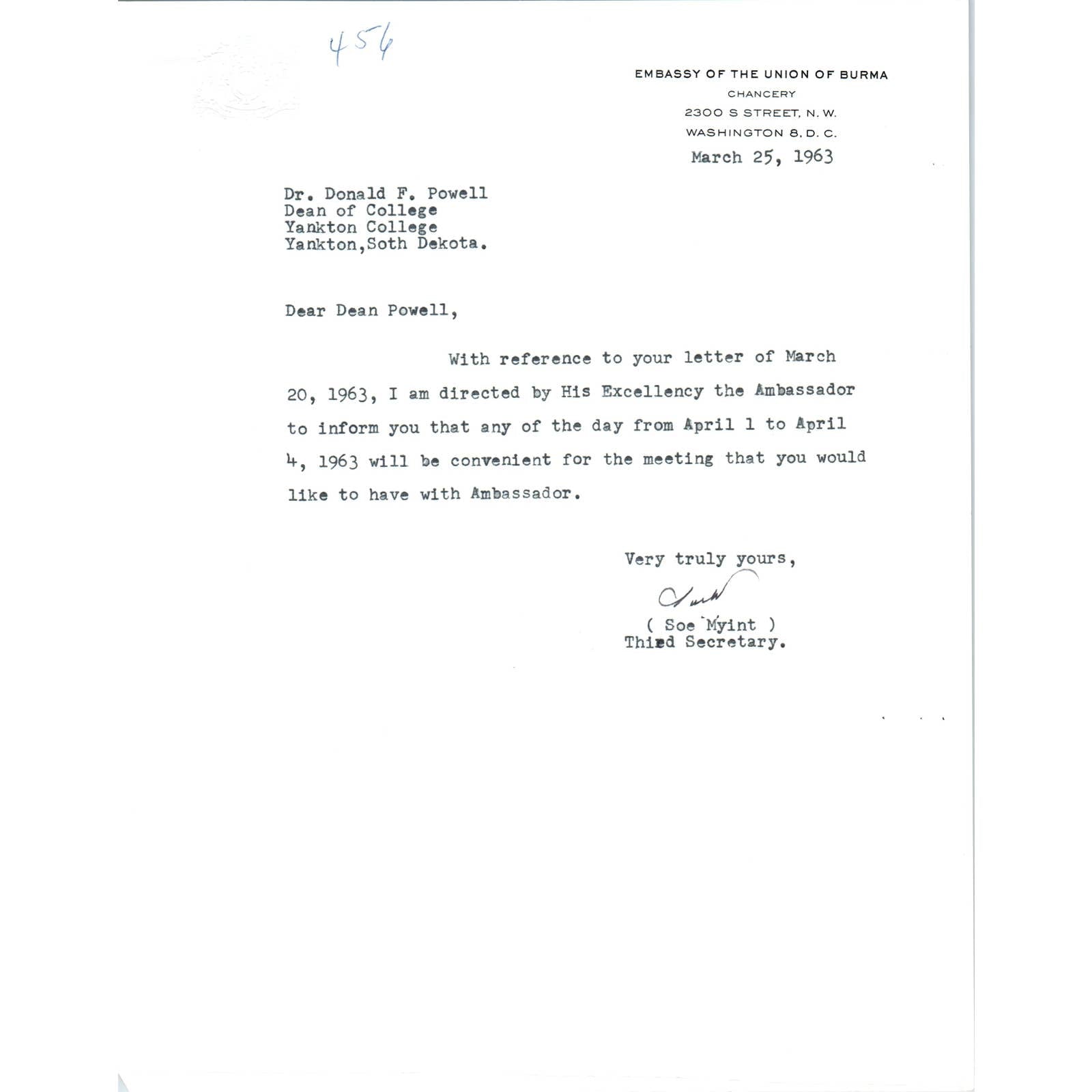 Embassy of The Union of Burma Official Letterhead Memo Soe Myint 1963 TK1-P10