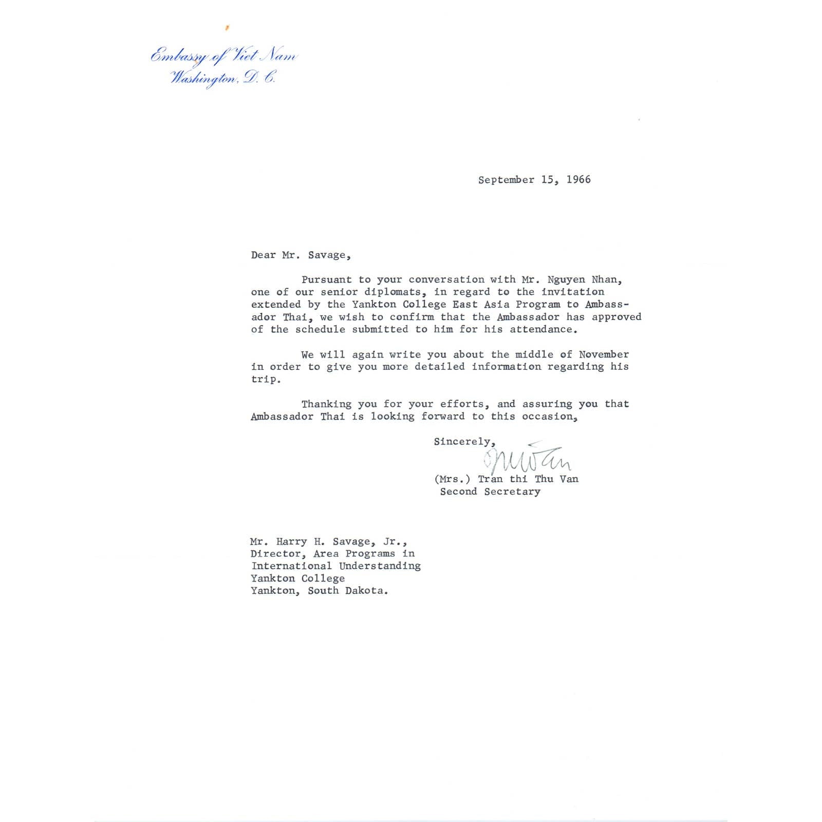 Embassy of Viet Nam Letterhead Memo Tran Thi Thu Van 9/15/66 TK1-P9