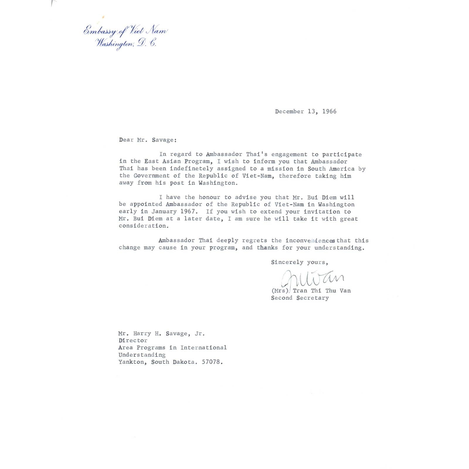 Embassy of Vietnam Official Letterhead Memo Tran Thi Thu Van 1966 TK1-P10